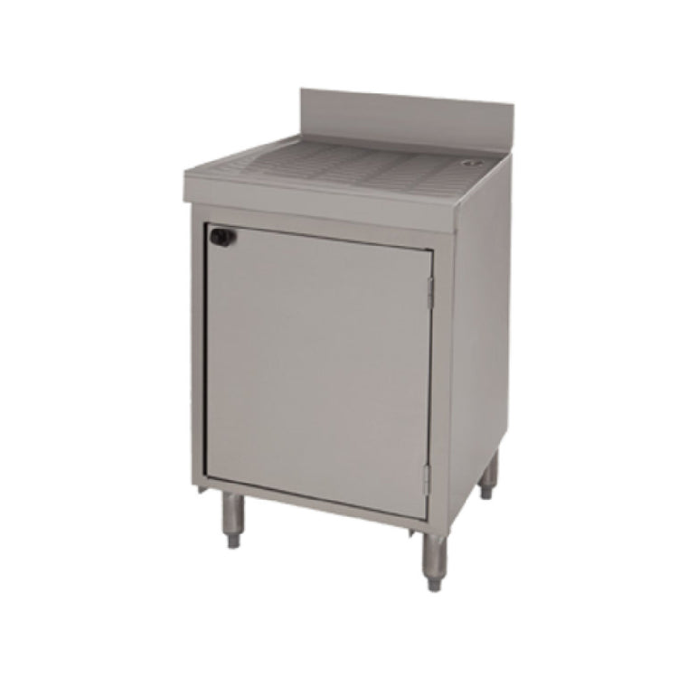 The Advance Tabco CRD-3BMD Underbar Basics™ Drainboard Cabinet Base with Mid-shelf & (2) Doors stands out as a versatile and practical solution for the efficient organization of underbar spaces. Measuring 36 inches in width, 21 inches in depth, and 33 inches in height, it is designed to fit seamlessly into various setups while providing ample storage and utility. This cabinet base is constructed entirely of stainless steel, ensuring durability and a sleek, professional appearance that meets the rigorous demands of commercial environments. The unit features a built-in mid-shelf that optimizes storage space, and two doors that provide easy access to the contents within. An integrated 4-inch backsplash helps prevent spillage and maintains cleanliness, while a 1-inch IPS drain further enhances its functionality. The cabinet is supported by stainless steel legs equipped with adjustable bullet feet, allowing for stability on uneven surfaces. Certified by NSF, the Advance Tabco CRD-3BMD underscores its commitment to maintaining public health and safety standards. This cabinet is an essential asset for bars and restaurants seeking reliable and efficient drainage and storage solutions within their operations.