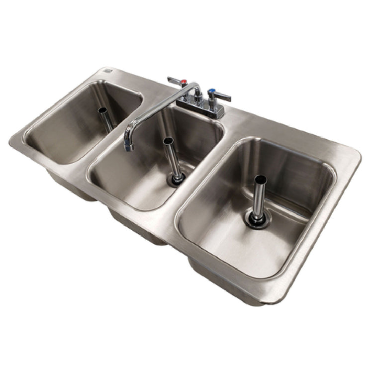 The Advance Tabco DBS-3 Bar Sink Drop-in 3-compartment is a meticulously designed sink solution tailored for professional bar environments. With an overall dimension of 38 inches in width and 19 inches in depth, this unit is optimized to fit seamlessly into compact spaces while providing ample washing capacity. Each of its three compartments measures 10 inches in width, 14 inches in depth, and 10 inches in height, offering distinct sections for washing, rinsing, and sanitizing. It includes 1-1/2 inch I.P.S. drains, ensuring efficient water flow and drainage. A 4-inch deck mount faucet with a 12-inch spout is included, delivering practical water access across all compartments. The package also comes with three 9-inch overflow pipes, preventing overfilling and ensuring smooth operation. Constructed from 20-gauge 300 series stainless steel, the Advance Tabco DBS-3 guarantees durability and resistance to corrosion, vital for high-traffic bar settings. Additionally, it meets NSF standards, reflecting its compliance with health and safety regulations. With a cutout size of 37-1/4 inches by 18-1/4 inches, this bar sink provides a precise, tailored fit for your installation needs, making it a versatile and essential asset in any bar service setting.