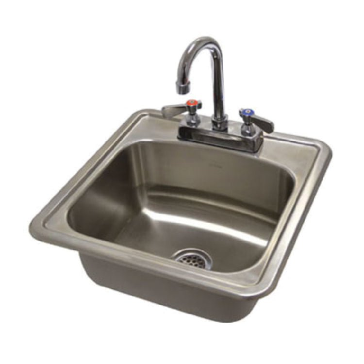 The Advance Tabco DI-1-1515-X Special Value Drop-In Sink - a single-compartment unit designed for efficiency in compact spaces - measures 15 inches in width, 15 inches in depth, and 6 inches in overall depth. Its bowl dimensions of 12-1/4 inches wide by 10-1/4 inches front-to-back and 6 inches deep provide ample space for various cleaning tasks. Crafted from 20-gauge, 304 stainless steel, this sink ensures durability and resistance to corrosion, making it suitable for long-term use in demanding environments. The sink features a no-drip self-rimmed edge, which helps contain spills and maintain a clean workspace. It is equipped with a 4-inch on-center deck-mounted gooseneck faucet, offering convenient water access and easy installation. Additionally, the sink includes a 3-1/2-inch basket drain with a strainer, enhancing its ability to efficiently handle waste. NSF certification validates its compliance with stringent health and safety standards. This sink is ideal for a variety of professional settings, including commercial kitchens, laboratories, and healthcare facilities, where space optimization and reliability are paramount. Its sleek design and functional features make the Advance Tabco DI-1-1515-X a practical solution for industries requiring robust, space-efficient equipment.