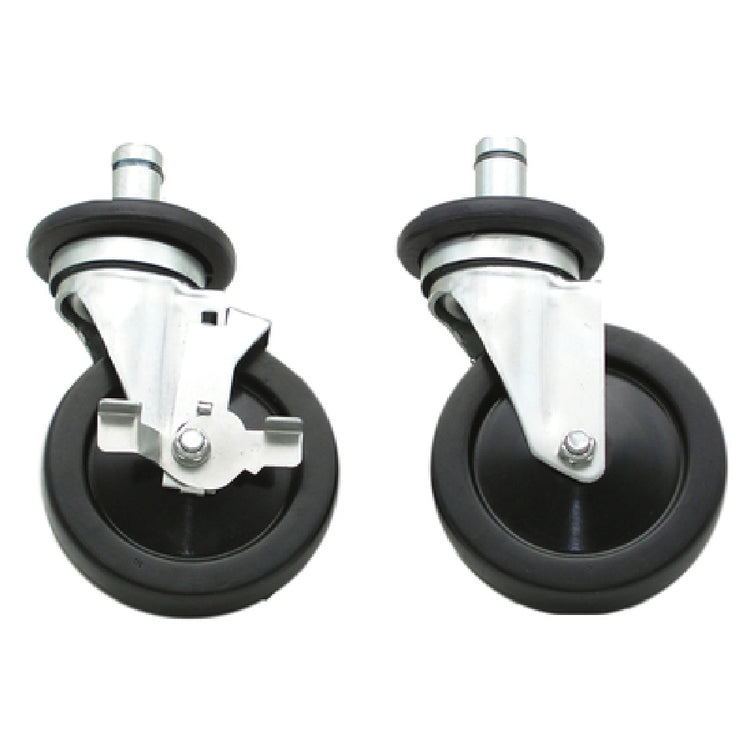 Advance Tabco EC-25-X Special Value Wire Shelving Stem Casters are an essential component for optimizing mobility and efficiency in various industrial settings. This set comprises four 5-inch swivel rubber casters, expertly designed to enhance the maneuverability of wire shelving units. Two of these casters come equipped with brakes, providing steady positioning when necessary, thus ensuring safety and stability during operations. These stem casters are specifically tailored for wire shelving, making them an indispensable choice for environments reliant on dynamic storage solutions. Additionally, the inclusion of donut bumpers serves to protect both the shelving and surrounding objects from potential damage during movement, highlighting the durability and thoughtful engineering of this product. The Advance Tabco EC-25-X casters are particularly beneficial for businesses in sectors such as retail, hospitality, and logistics, where adaptability and robust equipment are paramount. Their construction is focused on delivering reliable performance and ease of use, facilitating seamless transitions within any workspace. As an integral part of wire shelving systems, these casters provide not only practical functionality but also contribute to the overall efficiency of storage and retrieval processes, underscoring their value as a versatile asset in any professional environment.
