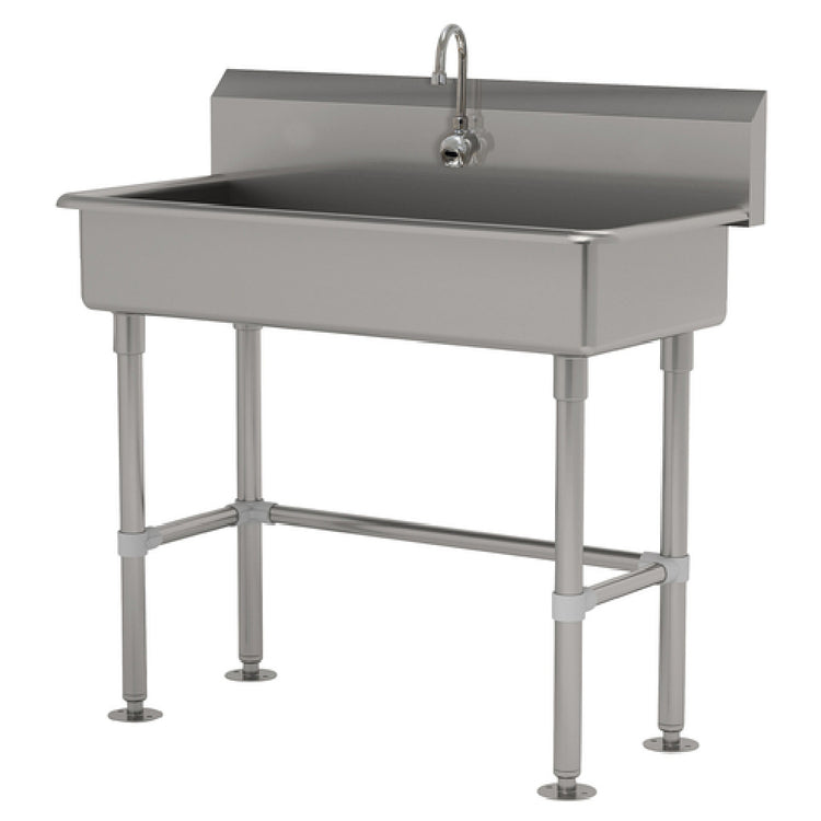 The Advance Tabco FC-FM-1-EFADA Service Sink Splash Mount Faucet Provision With Stainless Steel Legs And Flanged Feet is a highly specialized product designed for efficient use in various industrial and commercial settings. Engineered with a splash mount faucet provision, this sink is fitted with stainless steel legs and flanged feet for enhanced stability and support. The overall dimensions of 40"W x 19-3/4"D x 42-1/2"H underscore its substantial presence, while the bowl size of 14" front-to-back and 5" deep accommodates significant capacity for diverse cleaning tasks. The sink features an 8-1/2"H backsplash and is punched with a single faucet hole, facilitating customized installation. It includes a 1-1/2" basket drain, ensuring effective waste management. Constructed from 16 gauge 304 stainless steel, the sink guarantees durability and long-term resistance to corrosion. Meeting ADA compliance standards, it is accessible and user-friendly across different markets, including healthcare, hospitality, and food service industries. Additionally, the product is NSF certified, assuring adherence to public health and safety standards. The Advance Tabco FC-FM-1-EFADA offers a practical and reliable solution for environments requiring robust and accessible utility sinks.