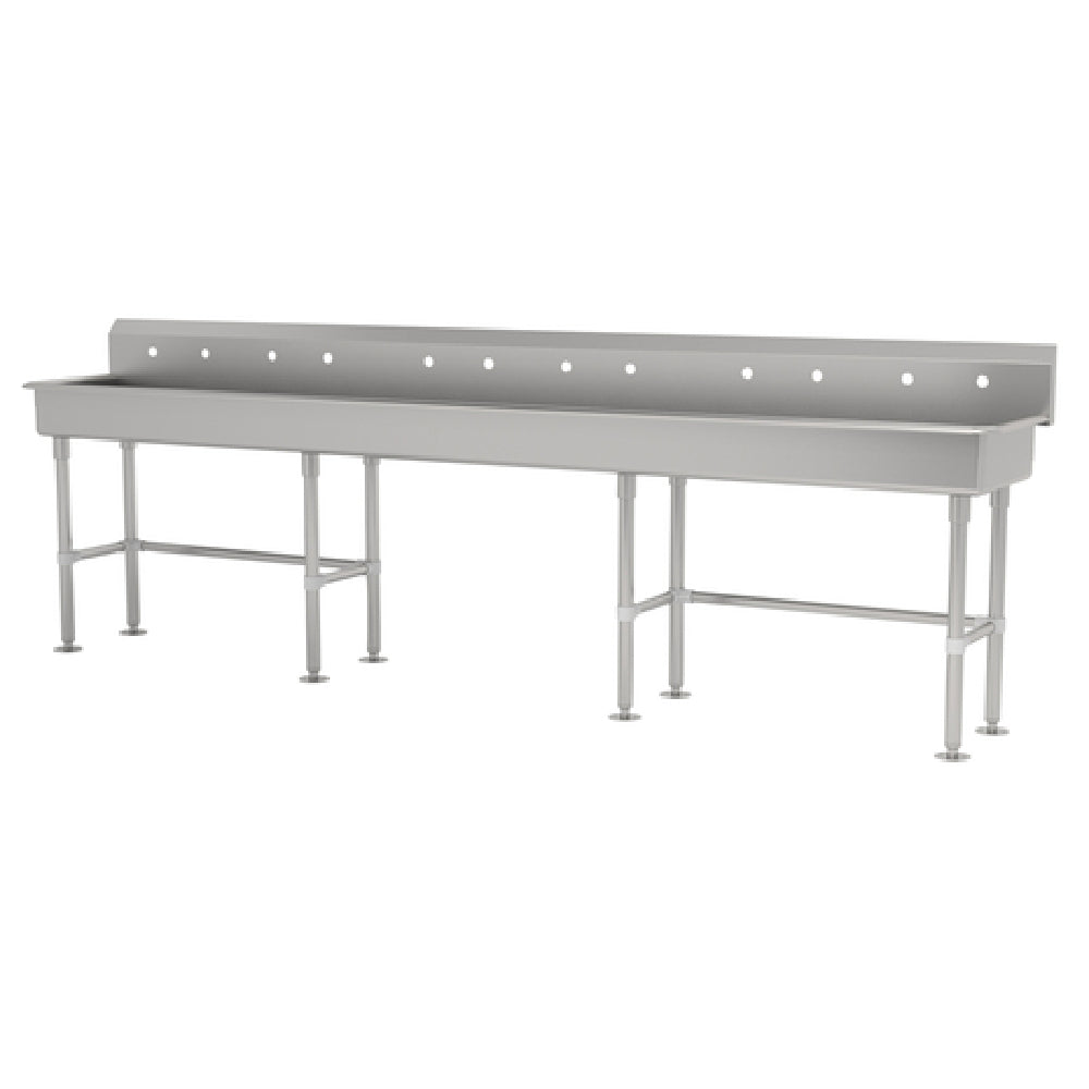 The Advance Tabco FC-FM-120-ADA-F Multiwash Hand Sink - splash mount faucet provision - is expertly designed for diverse commercial applications within the food service and healthcare industries. This robust hand sink features a spacious 120"W x 19-1/2"D x 42-1/2"H overall dimension with a bowl size of 16" front-to-back x 5" deep, providing ample space for efficient multi-user access. It includes six faucets equipped with wrist blades for ease of use, all mounted on a splash-mount provision with faucet holes punched 8" on center. The 8-1/2"H backsplash enhances sanitation by preventing water splashes, while the 3-1/2" rear basket drain ensures efficient water removal. Constructed from 16-gauge, 304 stainless steel, this hand sink guarantees durability and resistance to corrosion, supported by sturdy stainless steel legs with flanged feet for stability. Notably, the unit is NSF certified, affirming its compliance with public health standards, and ADA compliant, ensuring accessibility for all users. The Advance Tabco FC-FM-120-ADA-F is a reliable and versatile solution for environments demanding adherence to stringent hygiene standards and accessibility requirements.