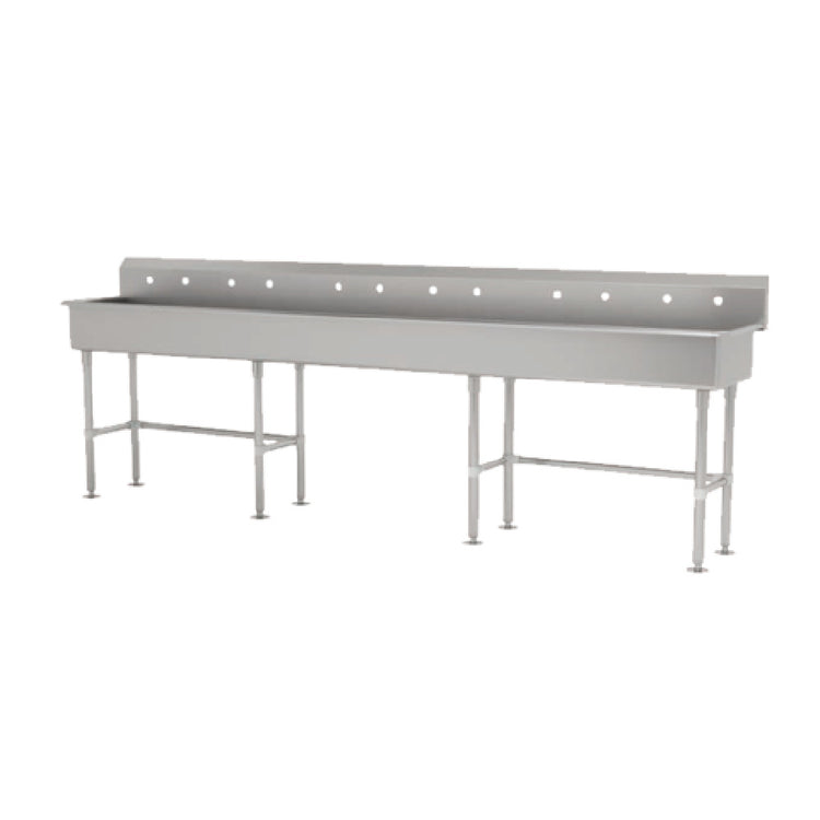 The Advance Tabco FC-FM-120 Multiwash Hand Sink stands as a versatile solution for commercial environments, combining practicality with robust construction. This hand sink features a splash mount faucet provision, catering to efficient water management needs. It measures an overall 120 inches in width, 19-1/2 inches in depth, and 42-1/2 inches in height, making it suitable for various space requirements. The bowl, with a front-to-back measurement of 16 inches and a depth of 8 inches, is designed for optimal use, ensuring ample space for handwashing. An 8-1/2-inch high backsplash effectively protects walls from water damage. The unit is punched with six sets of 8-inch on-center faucet holes, providing flexibility in faucet installation. Equipped with a 3-1/2-inch rear basket drain, the sink ensures efficient drainage and easy maintenance. Constructed from 16 gauge 304 stainless steel, it offers durability and resistance to corrosion, ideal for high-demand settings. The stainless steel legs and flanged feet ensure stability and support, while the NSF certification underscores its compliance with health and safety standards. This multiwash hand sink is a perfect fit for healthcare facilities, food service operations, and other industries requiring reliable sanitation solutions.