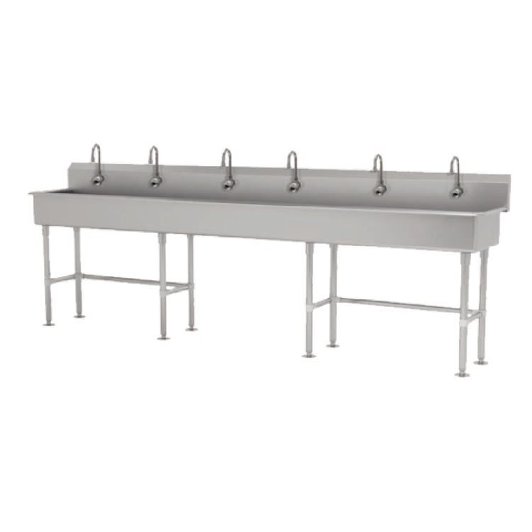 The Advance Tabco FC-FM-120KV Multiwash Hand Sink is an industrial-grade sink solution crafted for commercial environments requiring high standards of hygiene and functionality. This sink measures 120 inches in width, 19-1/2 inches in depth, and 42-1/2 inches in overall height, making it a substantial fixture. Its bowl size is engineered with a 16-inch front-to-back and 8-inch deep configuration, ensuring ample space for various washing needs. A key feature is its splash mount faucet provision, which accommodates multiple faucet configurations, complemented by a robust knee valve for hands-free operation. The sink is constructed from 16 gauge 304 stainless steel, renowned for its durability and resistance to corrosion, and is NSF certified, indicating compliance with public health standards. The design includes stainless steel legs with flanged feet for stability and an 8-1/2 inch high backsplash, punched with six single faucet holes, to prevent water spillage. Additionally, it features gooseneck spouts for ease of use and a 3-1/2 inch rear basket drain for efficient water disposal. This comprehensive setup is suitable for diverse segment markets within the food service and healthcare industries, providing reliability and versatility in fast-paced environments.