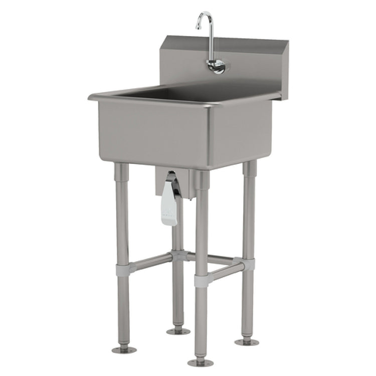 The Advance Tabco FC-FM-2219KV Service Sink is engineered for optimal performance in professional settings, offering a splash mount faucet provision that enhances its utility. This service sink is supported by robust stainless steel legs and flanged feet, ensuring stability and durability in demanding environments. The inclusion of a knee valve adds convenience for hands-free operation, making it particularly valuable for industries where hygiene and efficiency are paramount. With a bowl measuring 20 inches wide by 19-1/2 inches deep and 8 inches in depth, it offers ample space for various cleaning tasks. Crafted from 16 gauge stainless steel, the sink also features an 8-1/2-inch high backsplash, providing additional protection against water splashes. The single faucet hole is complemented by a gooseneck spout, which is ideal for tasks requiring extended reach. Additionally, it includes a 1-1/2-inch basket drain, facilitating efficient water drainage. Certified by NSF, this service sink meets rigorous public health and safety standards, making it a reliable choice for sectors such as healthcare, food service, and industrial applications. Its combination of practical design and durable construction underscores its unique value proposition in diverse professional industries.