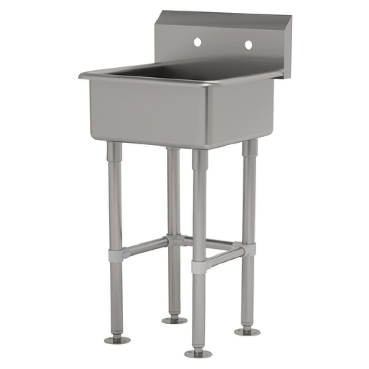 The Advance Tabco FC-FM-2721 Service Sink is a robust and highly functional fixture designed for demanding industrial environments. With splash mount faucet provision, this service sink is crafted to accommodate rigorous usage, making it an ideal choice for sectors such as food service, healthcare, and maintenance facilities. It features a spacious 24"W x 18"D x 12" deep bowl, providing ample space for various cleaning tasks. Constructed from 16-gauge stainless steel, the sink offers exceptional durability and resistance to corrosion. The 8-1/2"H backsplash ensures protection against water splashes, maintaining cleanliness and safety in the workspace. This model includes 8" faucet holes on center, facilitating straightforward faucet installation. Additionally, it is equipped with a 1-1/2" basket drain to ensure efficient water disposal. Stability is enhanced through its stainless steel legs and flanged feet, ensuring the sink remains securely in place during use. NSF certification underscores its compliance with rigorous health and safety standards, making it a reliable and compliant choice for professional settings. The Advance Tabco FC-FM-2721 Service Sink combines practical design with robust materials to deliver exceptional performance across various industry applications.