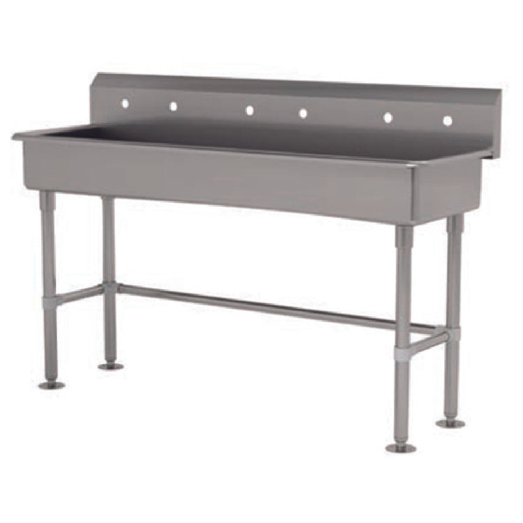 The Advance Tabco FC-FM-60-ADA-F Multiwash Hand Sink is a versatile and durable solution designed for various professional environments requiring a reliable handwashing station. This hand sink is crafted from 16 gauge 304 stainless steel, ensuring longevity and resistance to corrosion. The unit measures 60 inches in width, 19-1/2 inches in depth, and 42-1/2 inches in overall height, making it a substantial addition to any workspace. The sink features a bowl size of 16 inches front-to-back by 5 inches deep, suitable for multi-user scenarios. It includes three faucets equipped with wrist blades, enhancing ease of use, and is ADA compliant, promoting accessibility. The splash mount faucet provision is complemented by an 8-1/2-inch high backsplash, effectively preventing water spillage. The sink is punched with three sets of faucet holes at 8 inches on center, providing flexibility in faucet installation. It also comes with a 3-1/2-inch rear basket drain, assisting in efficient water drainage. Stainless steel legs with flanged feet offer stability and durability. This hand sink is NSF certified, aligning with industry standards for safety and sanitation. The Advance Tabco FC-FM-60-ADA-F is a practical choice for industries where hygiene and efficiency are paramount.
