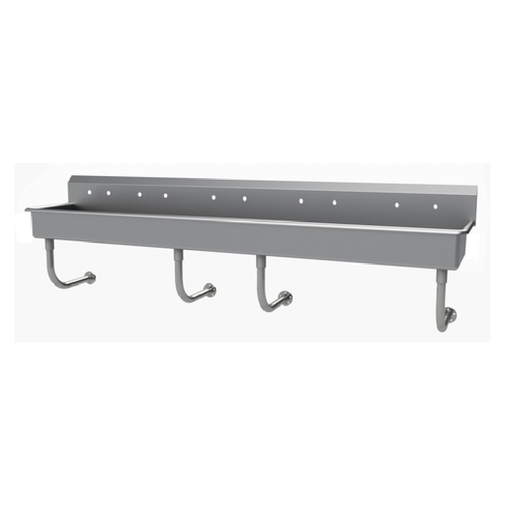 The Advance Tabco FC-WM-100-ADA Multiwash Hand Sink Splash Mount Faucet Provision is a wall-mounted sink designed for efficiency and compliance in various professional environments. Its overall dimensions are 100 inches in width, 19-1/2 inches in depth, and 25-1/2 inches in height. The sink bowl measures 16 inches front-to-back and 5 inches deep, providing ample washing space. An 8-1/2 inch high backsplash is included, enhancing its functionality by preventing water splashes on surrounding areas. The sink is punched with five sets of faucet holes at 8-inch centers, offering flexibility in faucet installation. Constructed from 16 gauge 304 stainless steel, the sink ensures durability and resistance to corrosion, making it ideal for rigorous use. The inclusion of a 3-1/2 inch rear basket drain facilitates efficient drainage. Supported by sturdy tubular stainless steel wall supports, the sink remains secure during use. Its compliance with NSF and ADA standards underscores its suitability for commercial and accessible environments, meeting high hygiene and accessibility criteria. The Advance Tabco FC-WM-100-ADA Multiwash Hand Sink is a versatile solution catering to the needs of various segments within the industry, from healthcare facilities to food service operations, prioritizing sanitation and adherence to industry standards.