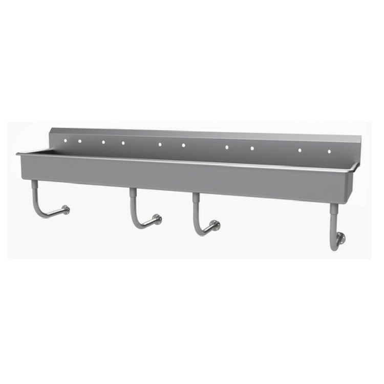 The Advance Tabco FC-WM-100 Multiwash Hand Sink is a highly versatile and functional fixture designed for varied professional settings requiring high standards of hygiene. With dimensions of 100"W x 19-1/2"D x 29-1/2"H overall, it features a bowl size of 16" front-to-back x 8" deep, providing ample space for effective hand washing. This wall-mounted sink includes a splash mount faucet provision, adding to its adaptability in diverse environments. The 8-1/2"H backsplash is designed for protection and ease of maintenance, while the unit is punched with five sets of faucet holes at 8" on center, accommodating a range of faucet installations. Constructed from 16 gauge 304 stainless steel, it promises durability and resistance to corrosion, ideal for demanding usage. Tubular stainless steel wall supports ensure stability and reliability. It includes a 3-1/2" rear basket drain for efficient water disposal. Additionally, this multiwash hand sink is NSF certified, ensuring compliance with strict public health and safety standards. The Advance Tabco FC-WM-100 effectively meets the needs of various industry segments, offering a robust and durable solution for sanitary requirements in commercial or industrial environments.
