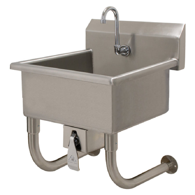 The Advance Tabco FC-WM-2219KV Service Sink is a meticulously designed wall-mounted unit, ideal for diverse professional environments requiring robust and versatile utility solutions. Featuring a splash mount faucet provision, this service sink integrates a knee valve, optimizing hands-free operation for enhanced hygiene and ease of use. The sink dimensions are 20 inches wide and 19-1/2 inches deep with an 8-inch deep bowl, crafted from 16-gauge stainless steel for exceptional durability and longevity. Its 8-1/2-inch high backsplash provides effective protection against water splashes, maintaining cleanliness in high-use areas. The single faucet hole accommodates a gooseneck spout, facilitating versatile water flow and access. This model includes a 1-1/2-inch basket drain, ensuring efficient water drainage and debris capture. Reinforced with stainless steel tubular wall supports, the sink guarantees stability and strength upon installation. NSF certification underscores its adherence to public health and safety standards, making it a preferred choice for institutions where hygiene and reliability are paramount. The Advance Tabco FC-WM-2219KV Service Sink is a reliable asset across various sectors, including healthcare, hospitality, and food service, providing a unique combination of practical design and superior functionality.