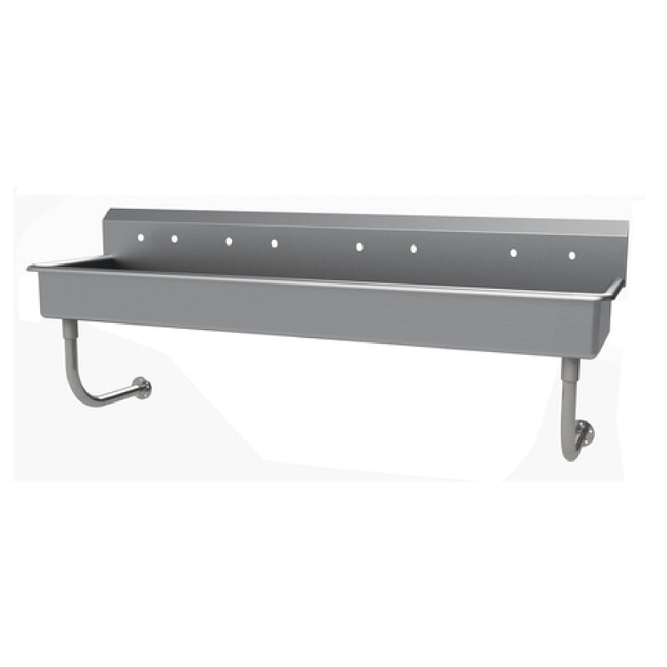 The Advance Tabco FC-WM-80-ADA Multiwash Hand Sink - splash mount faucet provision - wall mounted, is engineered to meet the rigorous demands of various professional environments. This sophisticated sink features an 80-inch wide by 19-1/2-inch deep design with an overall height of 25-1/2 inches. The bowl, sized at 16 inches front-to-back and 5 inches deep, provides ample space for multiwash applications. An 8-1/2-inch high backsplash effectively contains splashes, maintaining cleanliness and convenience. Designed with precision, the unit is punched with four sets of faucet holes, 8 inches on center, offering versatility in faucet installation. The inclusion of a 3-1/2-inch rear basket drain ensures efficient water management. Constructed from 16-gauge 304 stainless steel, this hand sink guarantees durability and longevity, while tubular stainless steel wall supports offer robust mounting. The product is both NSF and ADA compliant, ensuring it meets industry standards for safety and accessibility. This Advance Tabco hand sink is an ideal solution for commercial kitchens, healthcare facilities, and other institutional settings, providing a reliable and compliant fixture for hygienic operations.