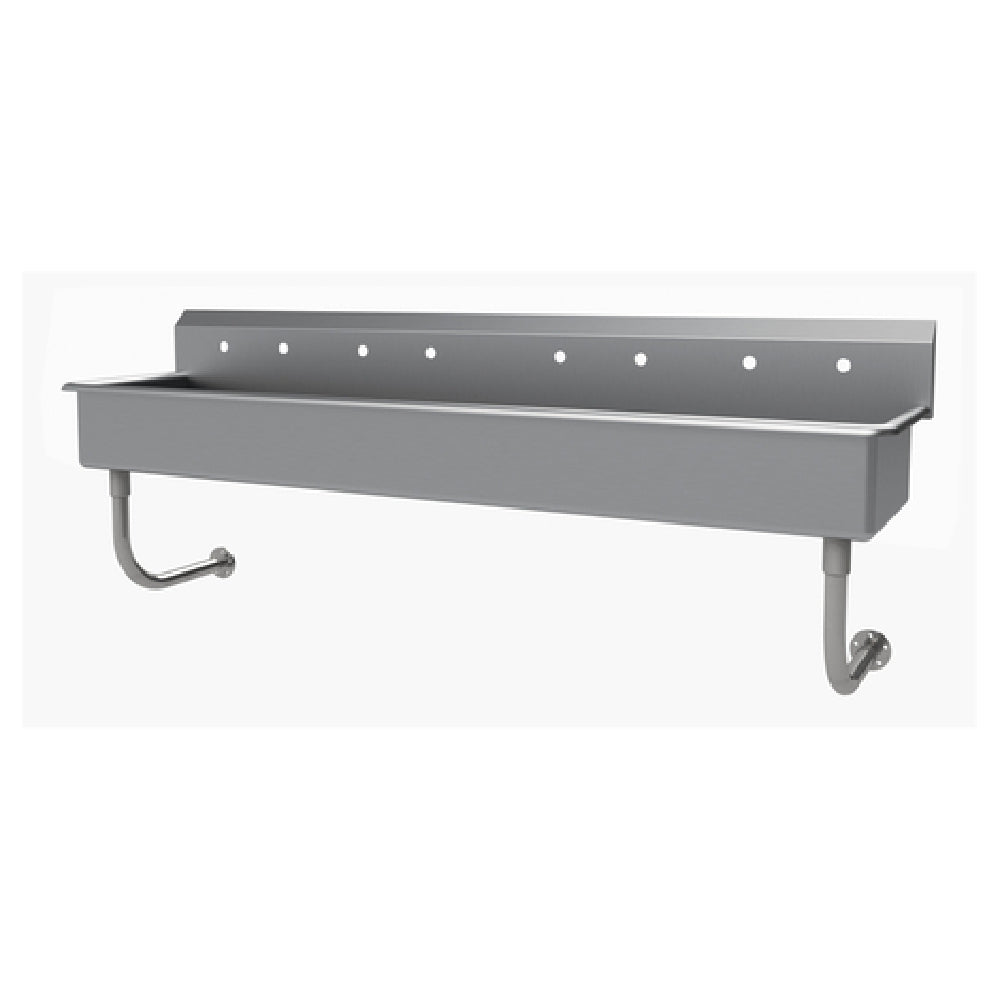 The Advance Tabco FC-WM-80 Multiwash Hand Sink - splash mount faucet provision - wall mounted, is an impressive addition to any professional kitchen or industrial space. Measuring 80 inches in width, 19-1/2 inches in depth, and 29-1/2 inches in height overall, this sink is engineered for robust utility. The bowl size is a generous 16 inches front-to-back by 8 inches deep, ensuring ample space for efficient handwashing. The 8-1/2 inch high backsplash is designed to maintain cleanliness and protect walls from moisture damage. The sink is punched with four sets of faucet holes at 8 inches on center, accommodating various faucet configurations to meet diverse requirements. It includes a 3-1/2 inch rear basket drain for efficient water disposal. Crafted from 16 gauge 304 stainless steel, this sink offers superior durability and resistance to corrosion, making it ideal for high-traffic environments. The inclusion of tubular stainless steel wall supports adds to the structural integrity. NSF certification confirms its compliance with rigorous public health standards, ensuring safety and quality. This wall-mounted sink is a practical choice for establishments seeking a reliable and efficient solution for handwashing needs.