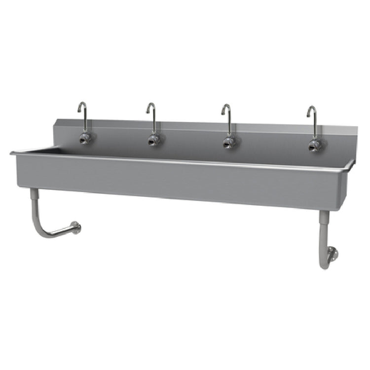 The Advance Tabco FC-WM-80EF Multiwash Hand Sink is a wall-mounted fixture designed for versatility in high-demand environments. It features a splash mount faucet provision and comes equipped with four electronic faucets, enhancing efficiency and hygiene. With dimensions of 80 inches in width, 19-1/2 inches in depth, and 29-1/2 inches in height overall, this sink is spacious and practical. The bowl is 16 inches from front to back and 8 inches deep, providing ample space for multi-user functionality. An 8-1/2 inch high backsplash helps contain splashes, maintaining a clean workspace. Crafted from 16-gauge 304 stainless steel, it ensures durability and resistance to corrosion, with tubular stainless steel wall supports adding robust stability. The sink includes a 3-1/2 inch rear basket drain to facilitate efficient water drainage. Punched with four single faucet holes, it offers convenience for various plumbing configurations. Certified by NSF, this hand sink meets rigorous standards for public health and safety. The Advance Tabco FC-WM-80EF is ideal for various segments, including commercial kitchens, healthcare facilities, and industrial settings, where multi-user access and reliable performance are essential.
