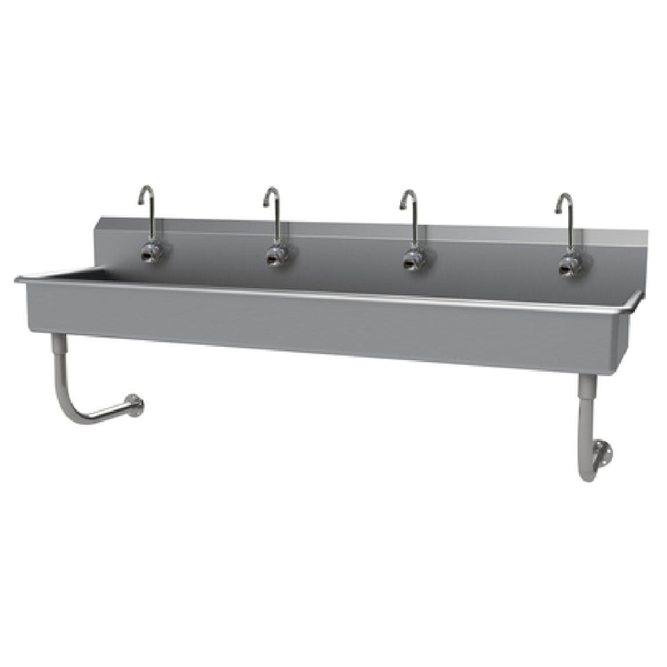 The Advance Tabco FC-WM-80EFADA Multiwash Hand Sink with splash mount faucet provision is a robust and versatile solution tailored for various professional environments requiring high standards of hygiene. This wall-mounted sink is equipped with four electronic faucets, enhancing user convenience and efficiency. Measuring 80 inches in width, 19-1/2 inches in depth, and 25-1/2 inches in height overall, it is designed to accommodate multiple users simultaneously. The sink's bowl is 16 inches front-to-back and 5 inches deep, providing ample space for washing tasks. An 8-1/2 inch high backsplash adds an extra layer of protection against splashes. The sink is punched with four single faucet holes, facilitating customizable faucet installations. It includes a 3-1/2 inch rear basket drain for efficient water management. Constructed from 16 gauge 304 stainless steel, it promises durability and resistance to corrosion. Tubular stainless steel wall supports provide robust mounting, ensuring longevity and stability. This product is NSF certified and ADA compliant, making it suitable for environments adhering to strict health, safety, and accessibility standards. Its comprehensive design and superior construction make the Advance Tabco FC-WM-80EFADA Multiwash Hand Sink an indispensable asset in commercial and institutional settings, including kitchens, healthcare facilities, and laboratories.