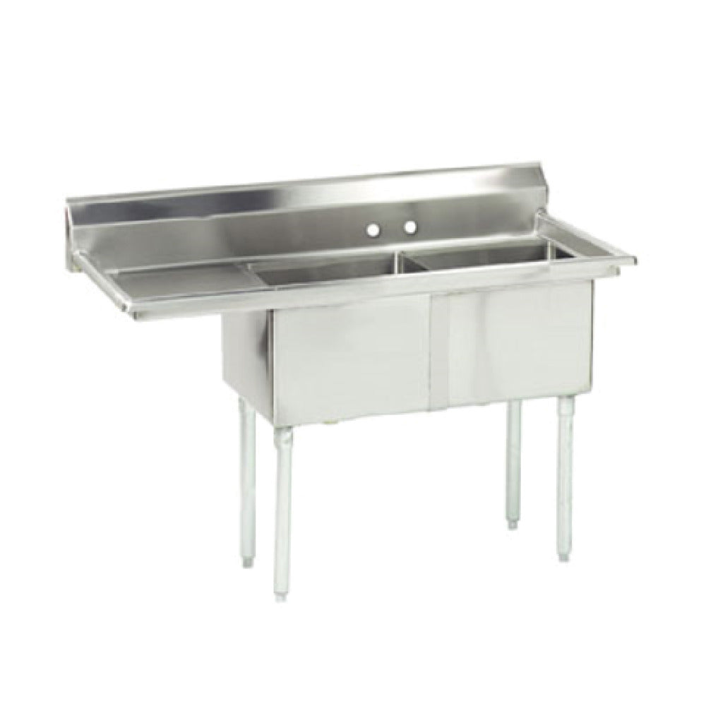 The Advance Tabco FE-2-1812-18L-X Special Value Fabricated Sink is an expertly designed 2-compartment unit, ideal for a variety of professional settings including restaurants and commercial kitchens. Made from 18 gauge 304 stainless steel, this sink promises durability and corrosion resistance, ensuring long-lasting performance. Each compartment measures 18" x 18" with a 12" depth, accommodating substantial washing needs. The inclusion of an 18" left drainboard provides additional workspace for drying or preparation tasks. Designed with a tile edge splash and rolled edge, it minimizes spillage and enhances cleanliness. The sink features 8" on-center faucet holes for compatible installations. Supported by galvanized legs and 1" adjustable plastic bullet feet, it offers stability on uneven surfaces. With overall dimensions of 23-3/4" front-to-back and 56-1/2" left-to-right, the FE-2-1812-18L-X fits seamlessly into a wide range of kitchen layouts. NSF certification underscores its adherence to public health and safety standards, enhancing its appeal to businesses prioritizing hygiene and safety. This sink caters to diverse market segments by offering a combination of robust construction, practical design, and compliance with industry standards, making it a valuable asset in any high-demand work environment.