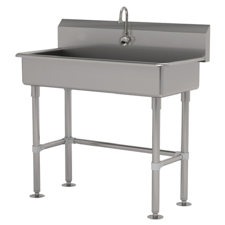 The Advance Tabco FS-FM-1-EFADA Service Sink Splash Mount Faucet Provision With Stainless Steel Legs And Flanged Feet is a meticulously designed unit crafted for industries demanding durability and compliance. This service sink features a splash mount faucet provision, providing essential space for faucet installation and ensuring efficient use. Engineered with stainless steel legs and flanged feet, it offers remarkable stability and strength. Measuring 40 inches in width, 19-1/2 inches in depth, and 42-1/2 inches in height overall, the unit accommodates a bowl size of 37 inches in width, 16 inches in depth, and 5 inches deep. The 8-1/2 inch high backsplash is punched with a single faucet hole, facilitating ease of faucet installation. A 3-1/2 inch rear basket drain is included for effective waste management. Constructed from durable 14-gauge 304 stainless steel, this service sink ensures longevity and resistance to corrosion. It is NSF certified and ADA compliant, reflecting its adherence to public health safety standards and accessibility regulations. The integration of an electronic faucet underscores its modern design, aligning with contemporary industrial needs. Ideal for sectors that prioritize hygiene and efficiency, the Advance Tabco FS-FM-1-EFADA stands as a testament to quality engineering and reliable functionality.