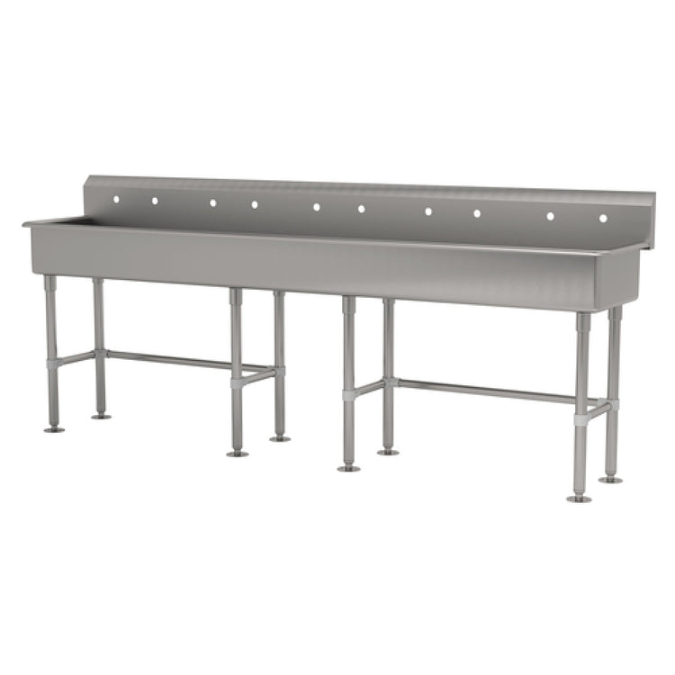 The Advance Tabco FS-FM-100 Multiwash Hand Sink is a meticulously designed unit, featuring a splash mount faucet provision and robust stainless steel legs with flanged feet for added stability. This hand sink is crafted with a 100-inch width, a depth of 19-1/2 inches, and an overall height of 42-1/2 inches, making it suitable for a variety of professional environments. The bowl itself measures 16 inches front-to-back and 8 inches deep, which allows for efficient use and cleaning. An 8-1/2 inch high backsplash is included and punched with five sets of faucet holes, each spaced 8 inches on center, providing versatility in faucet installation. The unit also comes with a 3-1/2-inch rear basket drain, ensuring efficient water management. Constructed from high-quality 14 gauge 304 stainless steel, this hand sink is NSF certified, signifying its adherence to public health and safety standards. The Advance Tabco FS-FM-100 is ideal for industries requiring stringent hygiene standards, such as healthcare, food service, and laboratory settings, offering durable and reliable performance with its substantial construction and practical design.