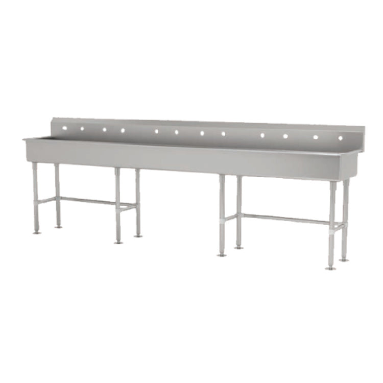 The Advance Tabco FS-FM-120 Multiwash Hand Sink is a premier solution for commercial environments requiring reliable and efficient handwashing facilities. Measuring a substantial 120 inches in width, 19-1/2 inches in depth, and 42-1/2 inches in height overall, this sink is engineered for high-capacity use. It features a bowl size of 16 inches front-to-back and 8 inches deep, complemented by an 8-1/2 inch high backsplash to minimize splashes—a crucial feature for maintaining cleanliness in busy kitchens. With a splash mount faucet provision, it supports customizable faucet installations, punched with six sets of faucet holes spaced 8 inches on center. The inclusion of three 3-1/2 inch rear basket drains ensures efficient water disposal. Built with durability in mind, its 14-gauge 304 stainless steel construction offers long-lasting performance, ideal for harsh industrial environments. The stainless steel legs and flanged feet provide stable support, while being NSF certified, it meets rigorous public health standards. The Advance Tabco FS-FM-120 is a versatile asset for diverse industry segments, from restaurants to healthcare facilities, seeking robust, hygienic, and functional handwashing stations that cater to high-demand scenarios.
