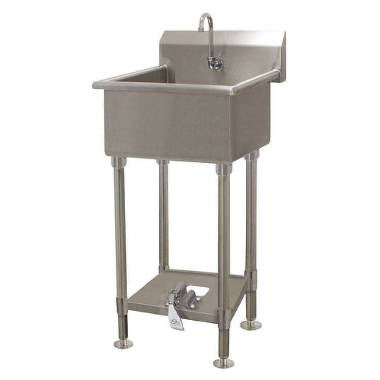 The Advance Tabco FS-FM-2721FV Service Sink Splash Mount Faucet Provision With Toe-operated Push Valve stands out in the realm of industrial sinks with its robust construction and functional design. This service sink features a spacious 24"W x 18"D x 12" deep bowl, crafted from 14-gauge stainless steel, ensuring durability and longevity in demanding environments. The 8-1/2" high backsplash provides excellent protection against water splashes, maintaining cleanliness and safety in your workspace. Its unique toe-operated push valve offers hands-free operation, enhancing workflow efficiency while minimizing contact with surfaces, a crucial feature for hygiene-sensitive areas. The sink is designed with a single faucet hole and a gooseneck spout, providing versatility and ease of use. Additionally, it comes equipped with a 3-1/2" rear basket drain, ensuring effective drainage and preventing clogging. The stainless steel legs and flanged feet provide sturdy support, while the pedal bracket support further stabilizes the sink. NSF certification underscores its compliance with essential public health standards, making it an ideal choice for a variety of professional settings, from commercial kitchens to healthcare facilities. This service sink combines practicality with reliability, catering to diverse industry requirements with its thoughtful design and high-quality materials.