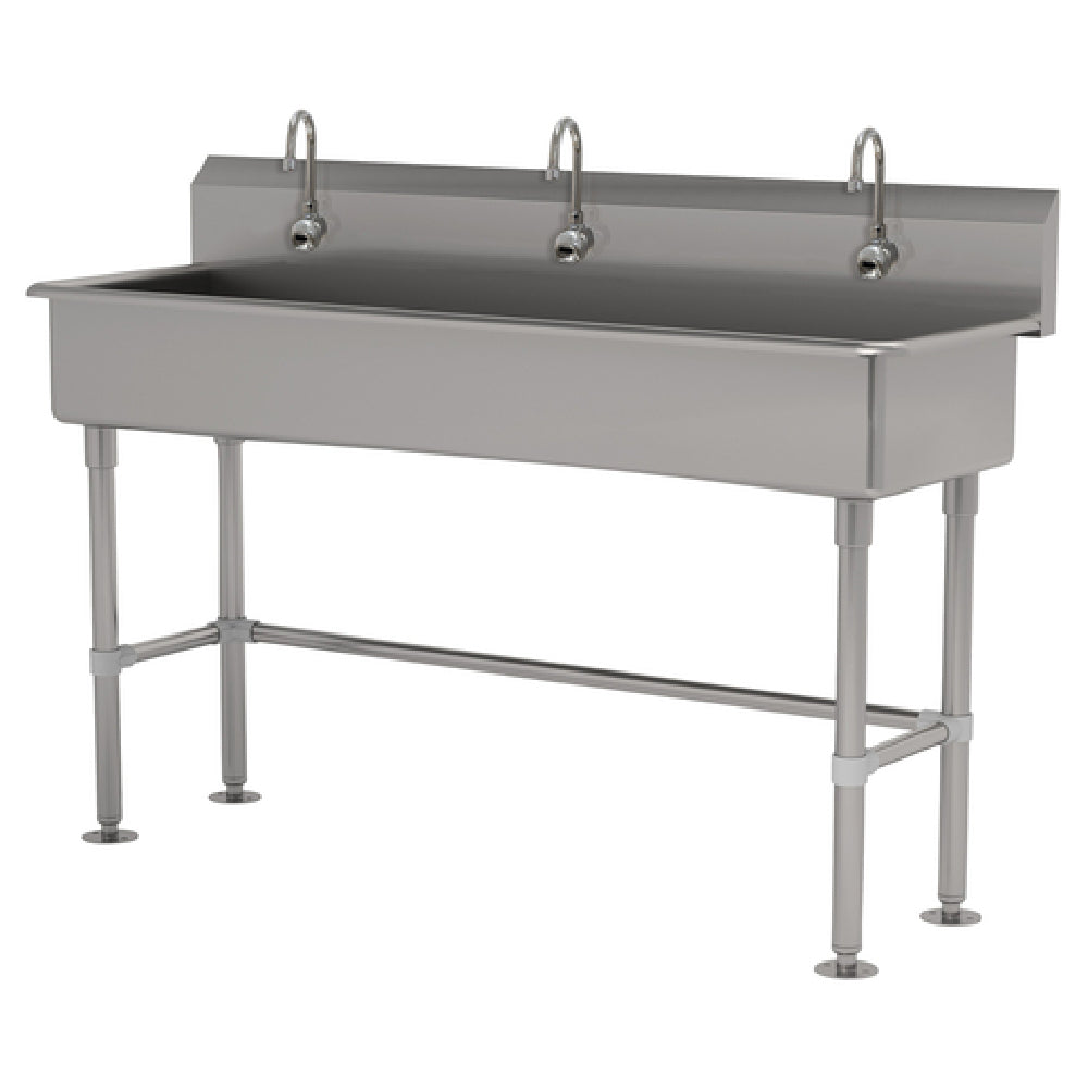 The Advance Tabco FS-FM-60EF Multiwash Hand Sink Splash Mount Faucet Provision With Stainless Steel Legs And Flanged Feet is a high-quality hand sink designed for efficiency and hygiene in commercial settings. This unit accommodates three users simultaneously, making it a practical choice for busy environments such as restaurants, hospitals, and industrial kitchens. It features three electronic faucets and measures 60 inches in width, 19-1/2 inches in depth, and 42-1/2 inches in height overall, with a bowl size of 16 inches front-to-back and 8 inches deep. The sink includes an 8-1/2 inch high backsplash, punched with three single faucet holes, which ensures easy installation and maintenance of the faucets. Its 3-1/2 inch rear basket drain aids in efficient water management. Constructed from robust 14 gauge 304 stainless steel, the sink is built to withstand high usage and maintain its appearance and functionality over time. The stainless steel legs and flanged feet provide stability and durability, essential for heavy-duty environments. Certified by NSF, this multiwash hand sink aligns with high standards of public health and safety, making it an essential fixture in any commercial operation seeking reliability and efficiency in its sanitary practices.