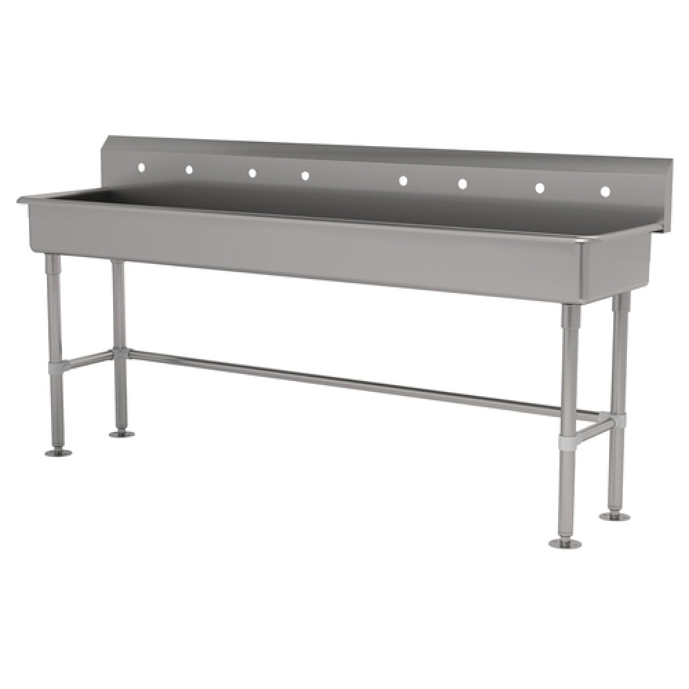 The Advance Tabco FS-FM-80-ADA Multiwash Hand Sink is a versatile and robust unit engineered to meet diverse industry needs. This hand sink features a splash mount faucet provision and includes stainless steel legs with flanged feet, ensuring both stability and ease of installation. Measuring 80"W x 19-1/2"D x 42-1/2"H overall, the sink is designed to fit a variety of spaces while maintaining ample capacity. The bowl size is 16" front-to-back and 5" deep, providing adequate space for thorough handwashing. An 8-1/2"H backsplash helps contain splashes and maintain cleanliness. The unit is punched with four sets of faucet holes on 8" centers, offering flexibility in faucet installation. The inclusion of a 3-1/2" rear basket drain aids in effective water management. Crafted from 14 gauge 304 stainless steel, the sink is highly durable and resistant to corrosion, making it ideal for demanding environments. It is both NSF and ADA compliant, highlighting its adherence to health, safety, and accessibility standards. This makes the Advance Tabco FS-FM-80-ADA Multiwash Hand Sink a valuable addition to commercial kitchens, healthcare facilities, and other settings where hygiene and accessibility are paramount.