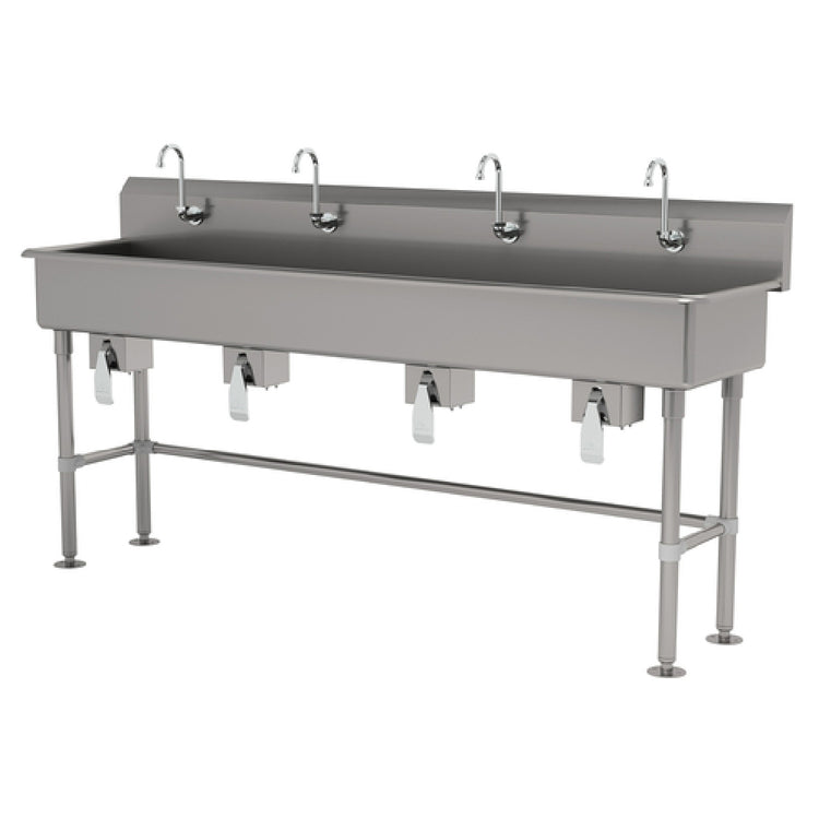 Advance Tabco FS-FM-80KV Multiwash Hand Sink is a highly functional fixture catering to diverse industrial applications, complete with a splash mount faucet provision and stainless steel legs with flanged feet for stability and durability. It features an overall dimension of 80 inches in width, 19-1/2 inches in depth, and 42-1/2 inches in height. The sink bowl measures 16 inches front-to-back and 8 inches in depth, which is ideal for various washing requirements. With an 8-1/2 inches high backsplash, it efficiently contains splashes, maintaining cleanliness in high-traffic environments. The unit is equipped with four single faucet holes, accommodating multiple gooseneck spouts for flexible water access. A 3-1/2 inches rear basket drain is included, ensuring smooth drainage while capturing debris. Constructed from 14 gauge 304 stainless steel, the FS-FM-80KV is robust and resistant to corrosion, making it suitable for rigorous use in settings such as commercial kitchens, laboratories, or healthcare facilities. The knee valve operation allows for hands-free use, promoting hygiene and convenience. This product is NSF certified, adhering to strict public health and safety standards, ensuring it meets industry requirements for quality and reliability.