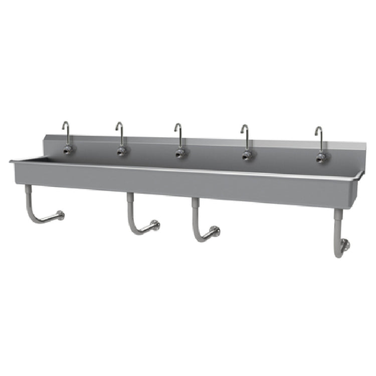 The Advance Tabco FS-WM-100EFADA Multiwash Hand Sink with splash mount faucet provision is a highly engineered solution for various industry segments requiring efficient hand-washing facilities. This wall-mounted unit measures 100 inches in width, 19-1/2 inches in depth, and 25-1/2 inches in overall height, providing ample space and accessibility. Designed to accommodate five electronic faucets, it features a bowl size of 16 inches front-to-back and 5 inches deep, ensuring sufficient capacity for multi-user environments. The 8-1/2 inch high backsplash is specifically punched with five single faucet holes, enhancing the sink's versatility and functionality. The inclusion of a 3-1/2 inch rear basket drain efficiently manages waste, promoting hygiene and easy maintenance. Constructed from 14 gauge 304 stainless steel, the sink exhibits both durability and corrosion resistance, while tubular stainless steel wall supports reinforce its structural integrity. As an NSF and ADA compliant product, it meets necessary safety and accessibility standards, making it an exceptional choice for healthcare facilities, commercial kitchens, and educational institutions. The Advance Tabco FS-WM-100EFADA Multiwash Hand Sink seamlessly combines functionality with robust construction, catering to diverse operational needs with its advanced design and reliable performance.
