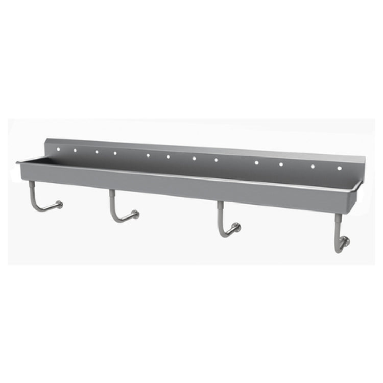 The Advance Tabco FS-WM-120-ADA Multiwash Hand Sink Splash Mount Faucet Provision is an expertly crafted solution designed for facilities requiring ADA compliance and high durability. This wall-mounted hand sink spans 120 inches in width, with a depth of 19-1/2 inches and an overall height of 25-1/2 inches, making it an expansive option for commercial environments. The sink features a bowl area measuring 16 inches from front-to-back and 5 inches in depth, allowing ample space for handwashing. Its 8-1/2 inch high backsplash is punched with six sets of faucet holes spaced 8 inches on center, accommodating various faucet installations. Additionally, the sink includes three 3-1/2 inch rear basket drains, enhancing its drainage capability. Crafted from robust 14 gauge 304 stainless steel, the sink promises long-lasting performance and corrosion resistance. It is supported by four tubular stainless steel wall supports, ensuring a secure and stable installation. Certified by the NSF, the Advance Tabco FS-WM-120-ADA Multiwash Hand Sink meets rigorous public health standards, making it an ideal choice for medical facilities, restaurants, or any setting where cleanliness and compliance are of utmost importance. This sink is a testament to functionality and compliance, tailored to meet diverse industry needs.