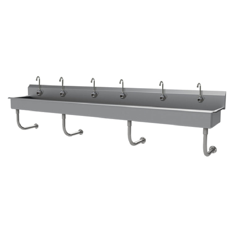 The Advance Tabco FS-WM-120EFADA Multiwash Hand Sink is an expertly designed unit tailored for high-demand environments requiring efficient handwashing facilities. Measuring 120 inches in width, 19-1/2 inches in depth, and 25-1/2 inches in height, this wall-mounted sink is constructed from durable 14-gauge 304 stainless steel, ensuring long-lasting use and resistance to corrosion. Featuring splash mount faucet provisions, it includes six electronic faucets, each supported by punched single faucet holes, enhancing its functionality for busy settings. The sink's bowl, measuring 16 inches front-to-back and 5 inches deep, is complemented by an 8-1/2 inch high backsplash, preventing water spillage and maintaining a clean environment. With three 3-1/2 inch rear basket drains, the sink ensures efficient drainage. Supported by four tubular stainless steel wall supports, this hand sink guarantees stability during use. It is both NSF and ADA compliant, meeting stringent public health standards and accessibility requirements. This makes it an ideal choice for various segments within the industry, such as healthcare facilities, restaurants, and schools, where hygiene and ease of access are paramount. The Advance Tabco FS-WM-120EFADA Multiwash Hand Sink stands out as a versatile and reliable solution for professional sanitation needs.