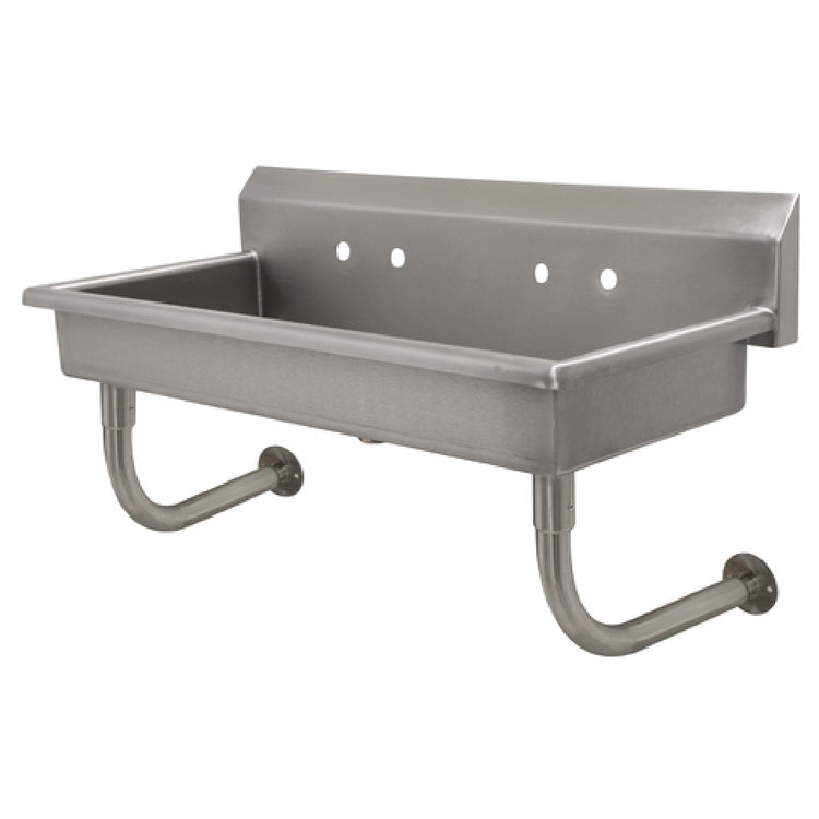 The Advance Tabco FS-WM-40-ADA Multiwash Hand Sink is a wall-mounted unit designed specifically to meet the needs of various industries requiring accessible and hygienic handwashing solutions. With a splash mount faucet provision, this sink measures 40 inches in width, 19-1/2 inches in depth, and 25-1/2 inches in height overall, providing ample space for efficient use. The sink bowl itself is 16 inches front-to-back and 5 inches deep, ensuring adequate capacity for effective washing. An 8-1/2 inch high backsplash helps maintain cleanliness by minimizing splashes. This model includes two sets of faucet holes punched at 8 inches on center, allowing for versatile faucet installations. A 3-1/2 inch rear basket drain is included, which aids in efficient water management and debris capture. Constructed from durable 14 gauge 304 stainless steel, the sink offers robustness and long-lasting use. It comes with tubular stainless steel wall supports for secure mounting. NSF compliance ensures it meets public health and safety standards, and ADA compliance guarantees accessibility for all users, making it a versatile option suitable for healthcare, food service, and commercial facilities seeking a reliable and compliant handwashing station.
