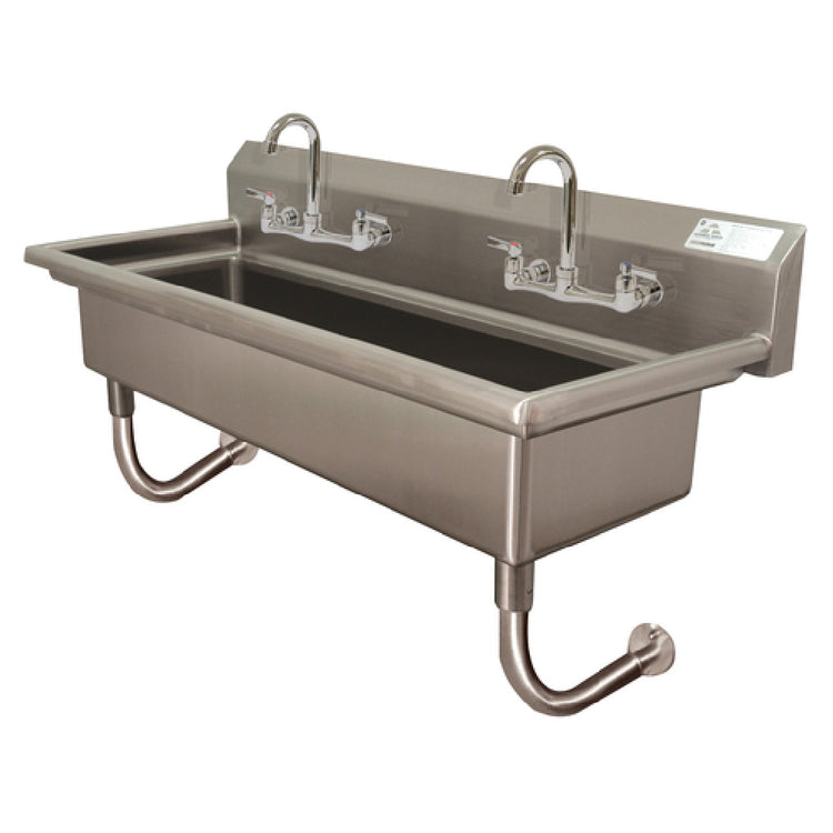 The Advance Tabco FS-WM-40-F Multiwash Hand Sink is a highly functional and meticulously designed unit well-suited for a variety of professional settings. With its wall-mounted configuration and splash mount faucet provision, this sink ensures efficient space utilization. Measuring 40 inches in width, 19-1/2 inches in depth, and 29-1/2 inches in height overall, it features a bowl size of 16 inches front-to-back and 8 inches deep, accommodating various washing needs. The 8-1/2-inch high backsplash is punched with two sets of faucet holes spaced 8 inches on center, allowing for versatile faucet installation. Constructed from 14 gauge 304 stainless steel, the sink promises durability and resilience against corrosion. It includes two faucets and a 3-1/2-inch rear basket drain for effective water management. Supported by tubular stainless steel wall supports, the sink ensures stability and long-lasting performance. Certified by NSF, the Advance Tabco FS-WM-40-F addresses industry standards for safety and hygiene, making it a valuable addition to environments requiring rigorous cleanliness and efficiency, such as food service establishments, healthcare facilities, and laboratories.