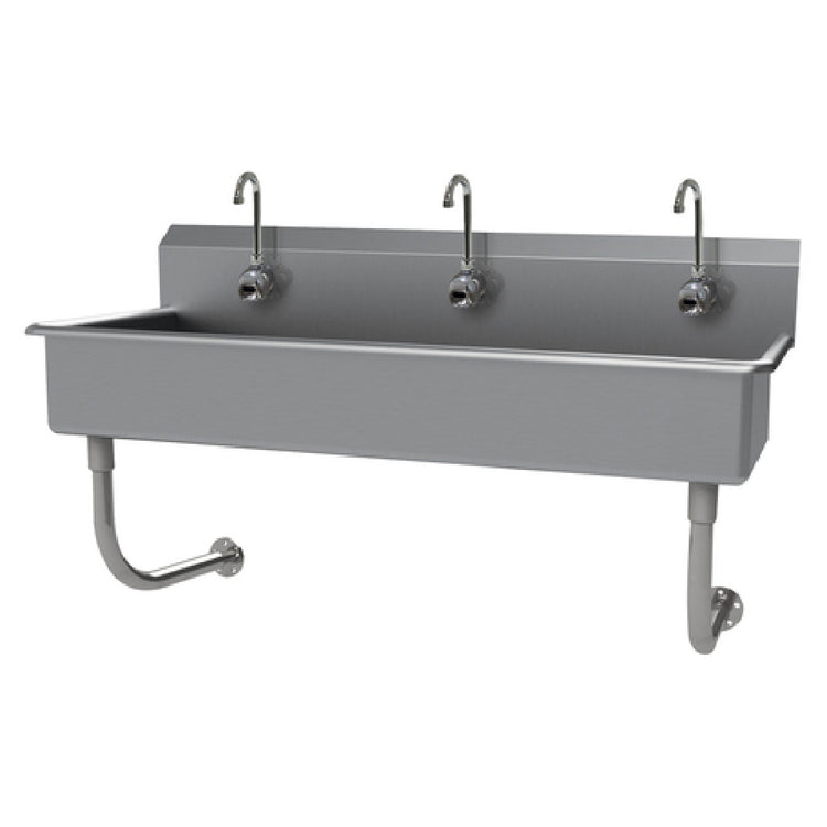The Advance Tabco FS-WM-60EF Multiwash Hand Sink is a versatile wall-mounted solution designed for high-demand environments requiring efficient and hygienic handwashing facilities. This unit accommodates up to three users simultaneously, each serviced by electronic faucets, enhancing its functionality in busy commercial settings. With a width of 60 inches, a depth of 19-1/2 inches, and a height of 29-1/2 inches, this sink is crafted to fit seamlessly into various spatial configurations. The bowl size measures 16 inches from front to back and 8 inches deep, offering ample space for thorough handwashing. Its 8-1/2 inch high backsplash ensures that water is contained, maintaining cleanliness and safety. Engineered with 14 gauge 304 stainless steel, this sink boasts remarkable durability and resistance to corrosion, ideal for long-lasting performance. The inclusion of a 3-1/2 inch rear basket drain facilitates effective water drainage, further contributing to its practical design. Tubular stainless steel wall supports provide robust stability, ensuring the unit remains secure during use. The unit is punched with three single faucet holes, tailored for the included electronic faucets, optimizing its user-friendly design. This product is NSF certified, guaranteeing adherence to public health and safety regulations, making it an exemplary choice for health-conscious commercial environments.