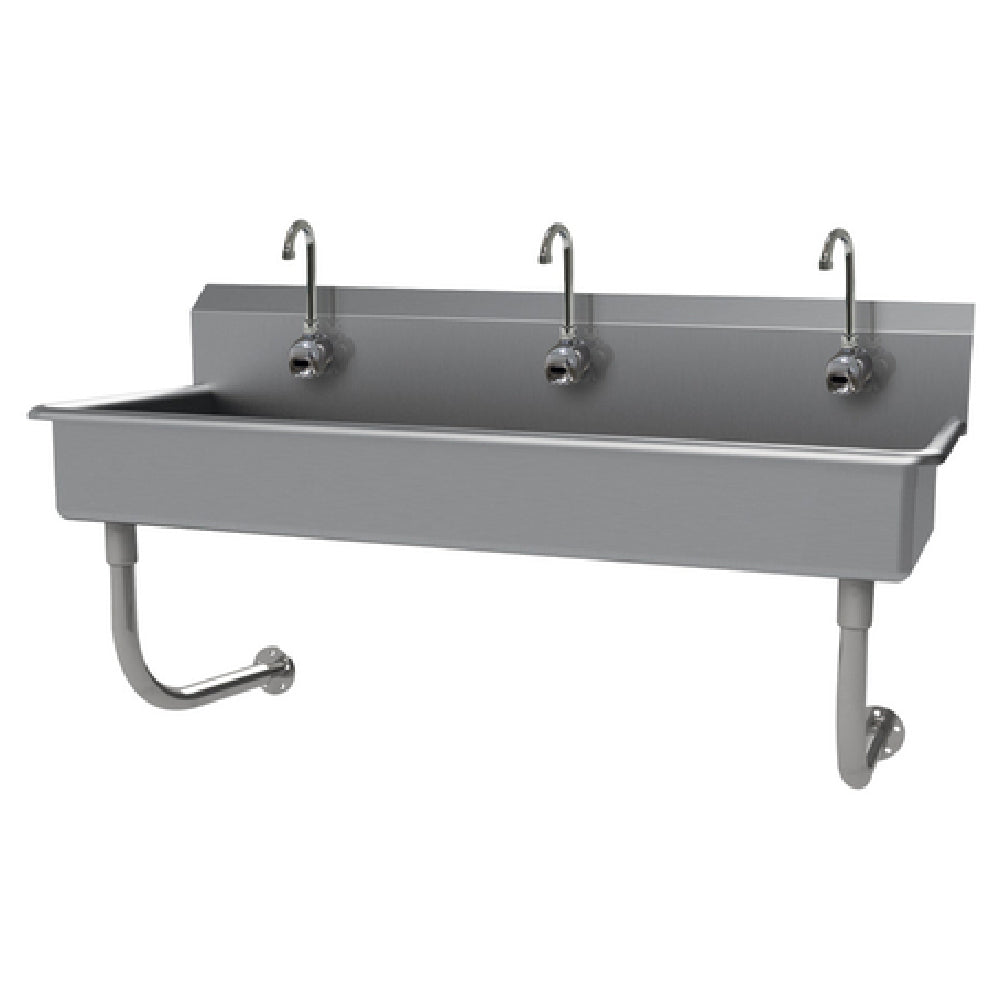 The Advance Tabco FS-WM-60EFADA Multiwash Hand Sink is a versatile wall-mounted unit designed to accommodate up to three users simultaneously. This innovative sink features a splash mount faucet provision and includes three electronic faucets, offering a modern and efficient handwashing solution. With overall dimensions of 60"W x 19-1/2"D x 25-1/2"H, it is crafted with a 16" front-to-back and 5" deep bowl, supported by an 8-1/2"H backsplash for enhanced hygiene. The sink is punctured with three single faucet holes, facilitating a seamless installation process. Constructed from 14 gauge 304 stainless steel, the FS-WM-60EFADA is built for durability and longevity. It includes a 3-1/2" rear basket drain for efficient waste management. The tubular stainless steel wall supports provide added stability, making it suitable for high-traffic environments. This hand sink is both NSF and ADA compliant, ensuring it meets rigorous health, safety, and accessibility standards. Ideal for various segments within the industry, such as healthcare, food service, and educational institutions, the Advance Tabco FS-WM-60EFADA offers a reliable and advanced solution for maintaining optimal hygiene standards in communal settings.