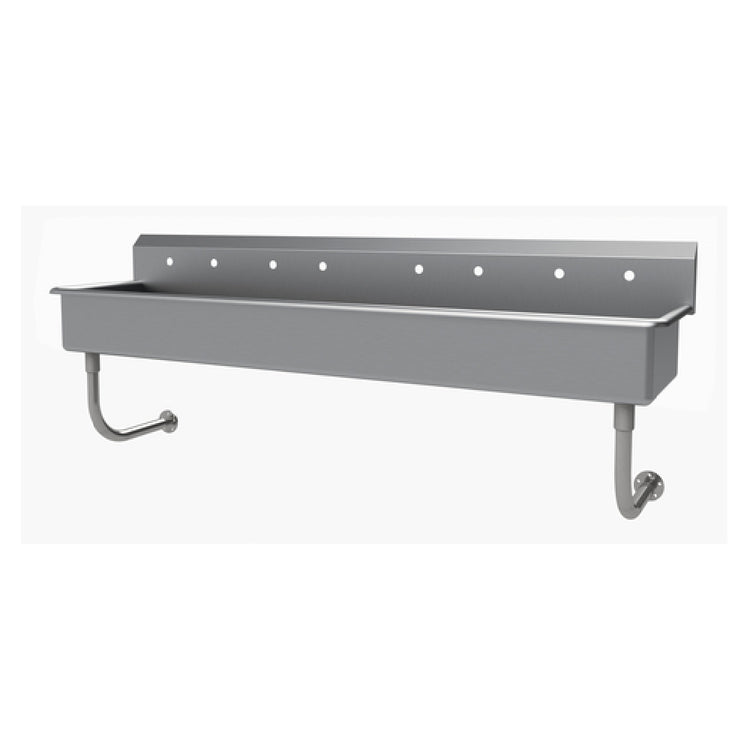 The Advance Tabco FS-WM-80 Multiwash Hand Sink Splash Mount Faucet Provision Wall Mounted is a highly efficient and space-saving solution designed for diverse industry applications, including healthcare, food service, and manufacturing environments. This versatile hand sink features an overall dimension of 80 inches in width, 19-1/2 inches in depth, and 29-1/2 inches in height, providing ample space for multiple users. The sink's bowl size measures 16 inches front-to-back and 8 inches deep, making it suitable for thorough hand washing. Its 8-1/2 inch high backsplash effectively prevents water splashes on adjacent walls, ensuring cleanliness and hygiene. Crafted from durable 14 gauge 304 stainless steel, the FS-WM-80 guarantees long-lasting performance and resistance to corrosion. It is equipped with four sets of faucet holes, each spaced 8 inches on center, allowing for flexible installation of splash mount faucets. A 3-1/2 inch rear basket drain is included, facilitating efficient water drainage. The sink is supported by tubular stainless steel wall supports, providing stability and ease of installation. The Advance Tabco FS-WM-80 is NSF certified, affirming its adherence to strict public health and safety standards. This multiwash hand sink is an ideal choice for any establishment requiring a reliable and spacious hand washing station.