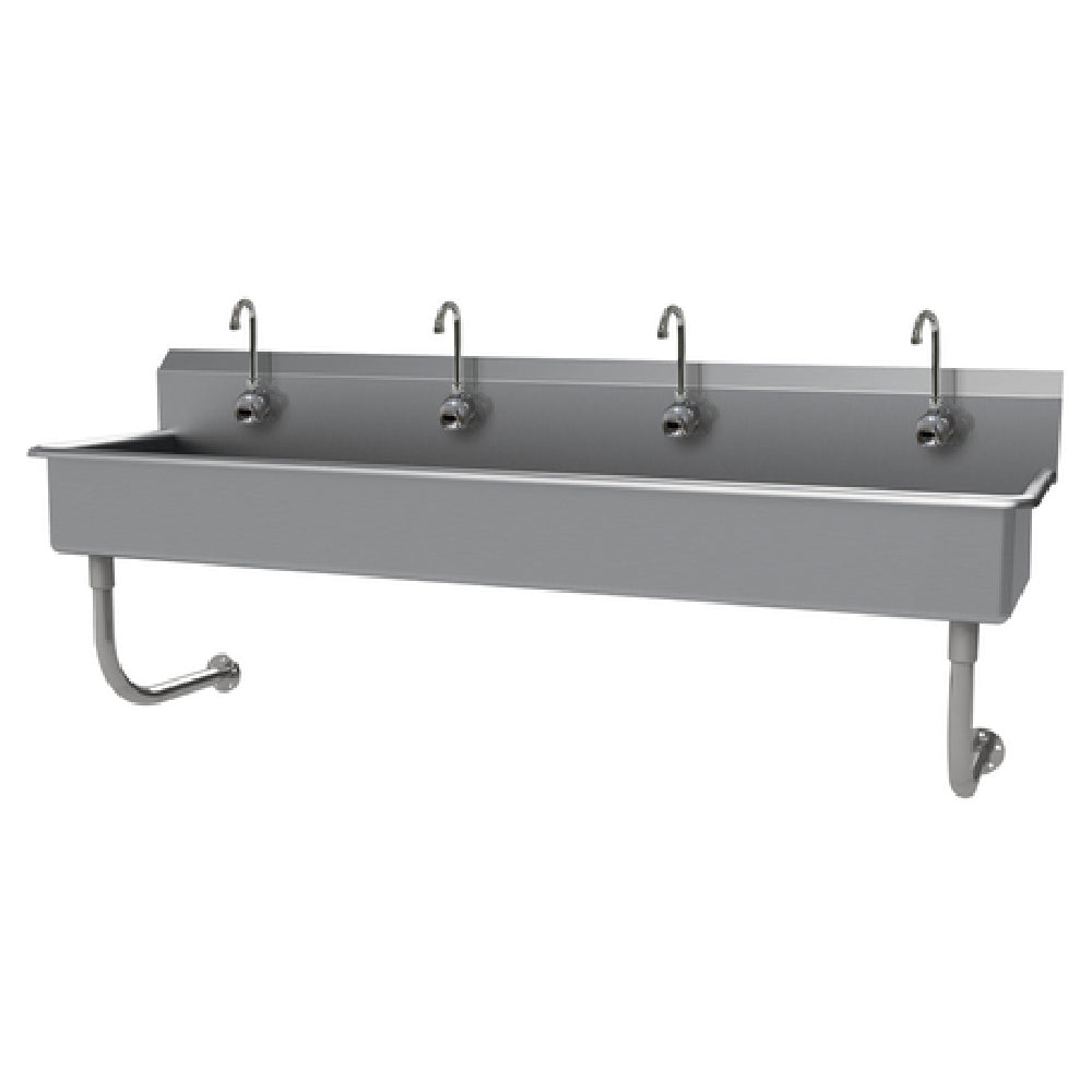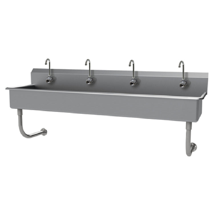 The Advance Tabco FS-WM-80EF Multiwash Hand Sink Splash Mount Faucet Provision Wall Mounted is a highly specialized fixture designed for diverse commercial environments requiring efficient handwashing solutions. Measuring an expansive 80 inches in width, 19-1/2 inches in depth, and 29-1/2 inches in height, this unit is expertly crafted from 14 gauge 304 stainless steel, ensuring durability and resistance to corrosion. The sink features a generous bowl size of 16 inches front-to-back by 8 inches deep, accompanied by an 8-1/2-inch high backsplash, which is essential for maintaining cleanliness and preventing water spillage. It is fitted with four electronic faucets, which contribute to hands-free operation, enhancing hygiene and water efficiency in high-traffic areas. This model incorporates a 3-1/2-inch rear basket drain, facilitating effective water drainage and reducing maintenance efforts. The FS-WM-80EF is punched with four single faucet holes, allowing for precise placement and installation of the faucets. Its tubular stainless steel wall supports provide secure and stable wall mounting, optimizing space in compact settings. As an NSF-certified product, it meets high standards of public health and safety, making it an ideal choice for industries ranging from healthcare facilities to food service establishments, where compliance and operational efficiency are paramount.