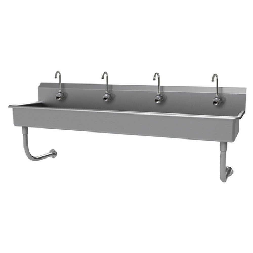 The Advance Tabco FS-WM-80EFADA Multiwash Hand Sink Splash Mount Faucet Provision is a high-quality, wall-mounted sink system designed for efficiency and compliance in commercial settings. Featuring dimensions of 80 inches in width, 19-1/2 inches in depth, and 25-1/2 inches in height overall, it includes a bowl size measuring 16 inches front-to-back and 5 inches deep. The design incorporates an 8-1/2 inch high backsplash and is punched with four single faucet holes, accommodating its four electronic faucets. The unit is constructed from durable 14 gauge 304 stainless steel, ensuring long-lasting performance and resistance to corrosion. Additionally, it includes a 3-1/2 inch rear basket drain for effective water management and tubular stainless steel wall supports for enhanced stability. The sink is both NSF and ADA compliant, making it suitable for a range of facilities, from healthcare to food service environments, where adherence to hygiene and accessibility standards is paramount. With its robust construction and thoughtful design, the Advance Tabco FS-WM-80EFADA is a reliable choice for those needing a multi-faucet hand washing station that meets industry regulations.