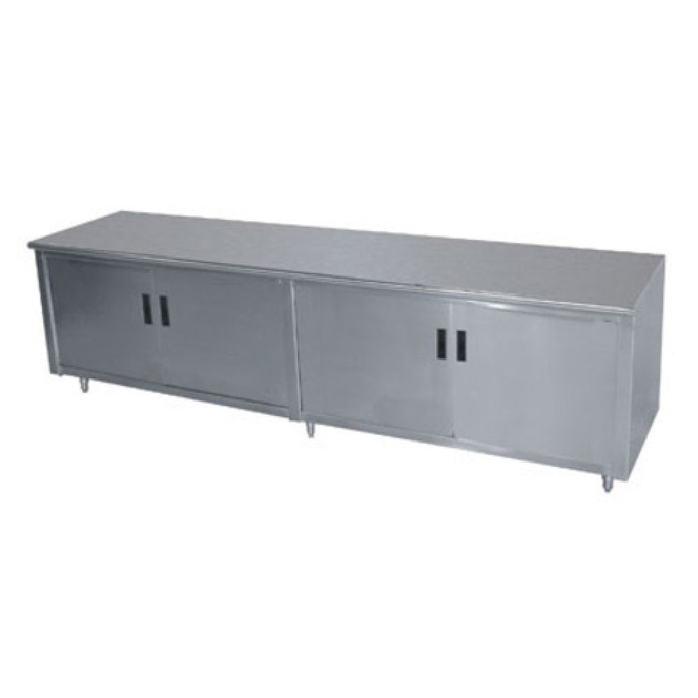 The Advance Tabco HB-SS-368M Work Table 96"W x 36"D Cabinet Base with Mid-shelf & Hinged Doors is a premium solution tailored for dynamic commercial environments. Constructed with a robust 14-gauge 304 stainless steel top, this work table is engineered for both durability and hygiene, addressing the needs of professional kitchens and industrial settings. The cabinet base includes a mid-shelf, providing efficient storage and organization for tools, ingredients, or equipment, thus enhancing workflow efficiency. Its hinged doors ensure easy access, facilitating quick retrieval of stored items. Supported by stainless steel legs with adjustable hex feet, the table maintains stability on uneven surfaces, a crucial feature for busy workspaces. Certified by NSF, this work table meets rigorous public health and safety standards, making it a reliable choice for diverse industries, from food service to manufacturing. With its expansive 96-inch width and 36-inch depth, the Advance Tabco HB-SS-368M offers ample workspace, accommodating various operational requirements while optimizing space utilization. This work table is a testament to quality engineering, designed to support high-performance and longevity in demanding environments, ensuring that professionals can rely on its functionality and resilience in everyday use.