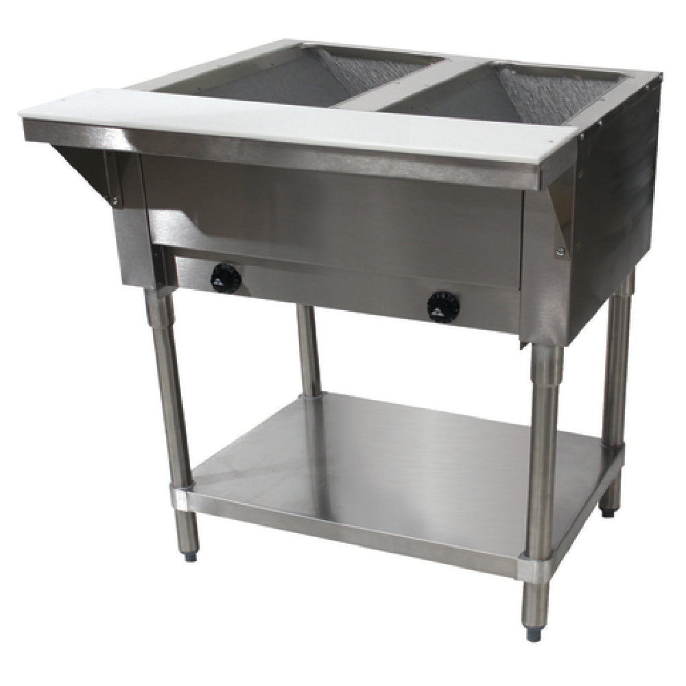 The Advance Tabco HF-2G-NAT Hot Food Table is specifically engineered for efficiency in commercial kitchens, offering a compact yet robust solution for maintaining hot food temperatures. Measuring 31-13/16"W x 30-5/8"D x 34-3/8"H, this unit is powered by natural gas, ensuring consistent and reliable heating. It features two 12" x 20" hot food wells, each equipped with individual controls that provide flexible temperature management across 3 settings. This allows caterers and food service providers to efficiently manage food presentation and safety, catering to a variety of culinary environments. The stainless steel top enhances durability and provides a sleek, easy-to-clean surface, while the 8"D support shelf accommodates additional storage needs. A removable 3/8" thick poly cutting board adds a versatile prep space, making the HF-2G-NAT a multifaceted addition to any kitchen. The pilot indicator opening offers straightforward monitoring of the unit's operational status, ensuring seamless service. Constructed with high-quality materials, this hot food table is ideal for restaurants, catering services, and institutional kitchens that demand reliability and versatility in food service equipment. Its thoughtful design maximizes operational efficiency while maintaining a strong focus on durability and functionality.