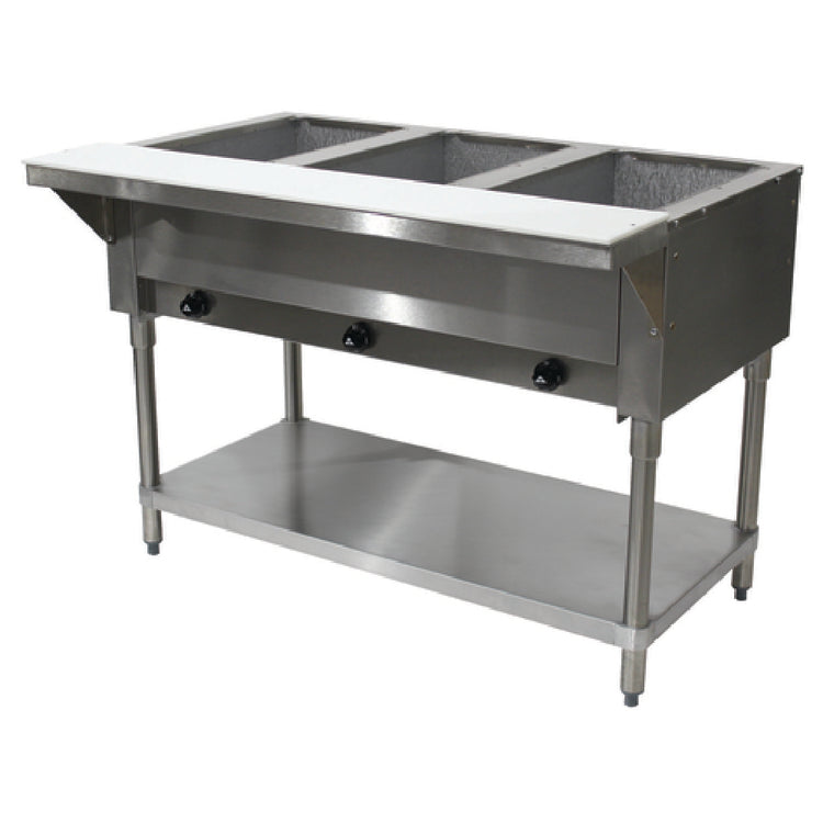 Advance Tabco, HF-3G-NAT-X, Hot Food Table, natural gas, 47-1/8"W x 30-5/8"D x 34-3/8"H, (3) 12" x 20" hot food wells, individual controls with 3-setting, pilot indicator opening, stainless steel top, stainless steel 8”D support shelf with removable 3/8” thick poly cutting board, g