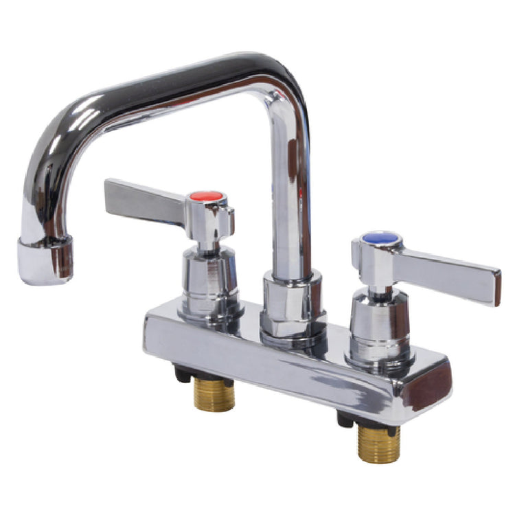 The Advance Tabco K-124 Faucet is a deck-mounted fixture distinguished by its 4" OC (on-center) configuration and a 6" swivel "D" style spout, making it a versatile choice for various commercial and industrial applications. This faucet boasts chrome-plated wedge handles, which are clearly marked with hot and cold indexes, ensuring intuitive operation and ease of use for any kitchen or washroom environment. The robust brass chrome-plated body and spout enhance durability, promising a long-lasting performance even in high-demand settings. Importantly, the Advance Tabco K-124 Faucet is lead-free, aligning with stringent safety standards and making it suitable for establishments prioritizing health and environmental safety. Its design and build quality make it especially appealing for food service industries, healthcare facilities, and educational institutions where reliable and efficient water fixtures are essential. By integrating this faucet into your workspace, you are investing in a product that combines practical functionality with a commitment to safety and durability, meeting the diverse needs of modern industry applications.