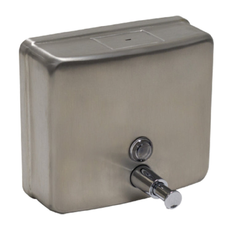 The Advance Tabco K-13 Soap Dispenser is a wall-mounted unit with dimensions of 7"W x 2-3/4"D x 6-1/4"H, specifically designed for efficient and convenient soap dispensing in various settings. This dispenser features a substantial liquid soap reservoir with a capacity of 40-1/2 oz, ensuring minimal refills and maintaining a consistent supply of soap for high-traffic areas. It operates via a user-friendly push button mechanism, allowing for controlled dispensing and reducing soap wastage. The inclusion of a soap level window provides a clear view of the remaining soap, facilitating timely refills and ensuring uninterrupted service. Constructed from durable stainless steel, the dispenser is both corrosion-resistant and easy to clean, making it suitable for environments such as commercial kitchens, healthcare facilities, and public restrooms. The Advance Tabco K-13 also includes a reservoir key and a mounting bracket, simplifying installation and maintenance. Its robust design and practical features cater to the needs of various industries, providing a reliable and hygienic soap dispensing solution. This unit exemplifies a balance of functionality and durability, making it an ideal choice for establishments seeking a dependable dispenser that supports cleanliness and efficiency.