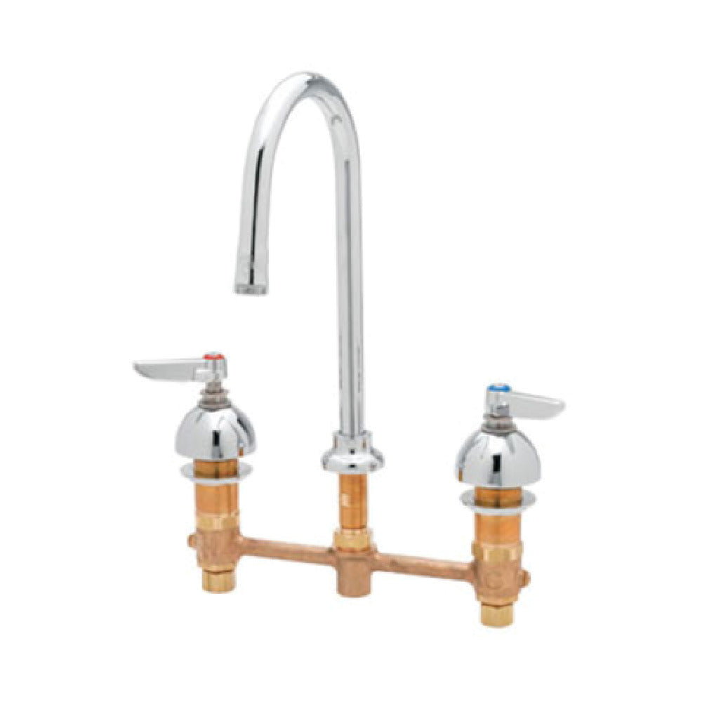 The Advance Tabco K-132 Faucet - (3) hole deck mounted 8" OC - is engineered for precision and reliability, making it an essential fixture across various industry sectors. Specifically designed to accommodate a three-hole deck mount configuration, this faucet features an 8-inch on-center setup, providing a standardized fit for professional installation. The fixed 5-1/2-inch gooseneck spout ensures a steady, direct flow of water, streamlining operations in busy environments. Aesthetically, the faucet boasts chrome-plated wedge handles, distinguished by hot and cold indexes, offering both visual appeal and functional ease of use. The robust construction is underscored by a brass chrome-plated body and spout, ensuring longevity and resistance to wear and tear. Additionally, the faucet's lead-free composition supports compliance with health and safety standards, making it suitable for use in commercial kitchens, healthcare facilities, and educational institutions. Its combination of durable materials and thoughtful design makes the Advance Tabco K-132 Faucet a valuable choice for those seeking reliability and performance in high-demand settings.