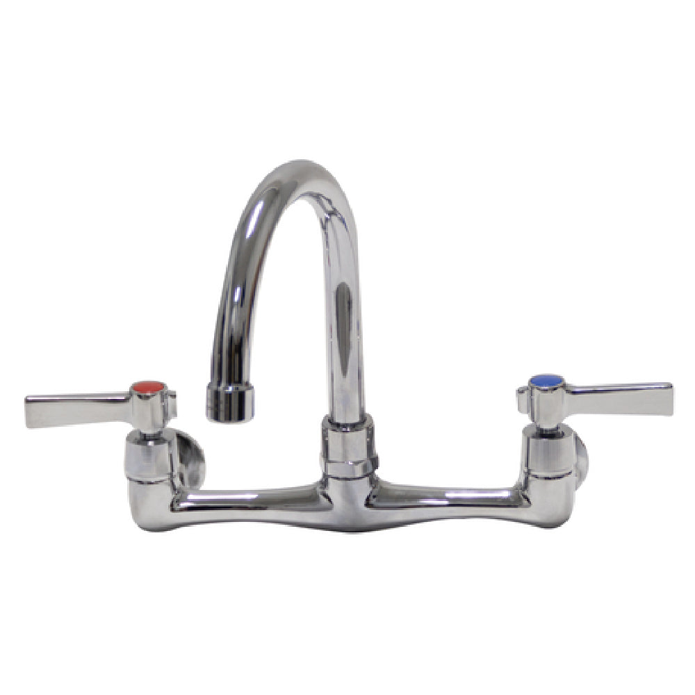 The Advance Tabco K-161 Faucet is a heavy-duty splash mount fixture designed to meet the demanding needs of various commercial environments. Featuring an 8-inch on-center splash mount, this faucet is tailored for robust installation, ensuring stability and durability in high-traffic settings. The 6-inch gooseneck spout is designed for convenience and accessibility, allowing for easy cleaning and filling of large pots or containers. Crafted with a brass chrome-plated body and spout, the faucet combines aesthetic appeal with resistance to rust and corrosion, enhancing longevity. The chrome plated wedge handles, clearly marked with hot and cold indexes, provide easy and precise temperature control. With a flow rate of 2.2 gallons per minute (8.3 liters per minute) at 60 PSI, this faucet delivers efficient water usage suitable for various applications in the food service industry. The Advance Tabco K-161 Faucet is an excellent choice for those seeking a blend of functionality, durability, and style in commercial kitchen settings, ensuring that it meets the rigorous standards required for day-to-day operations.