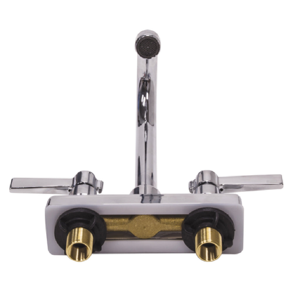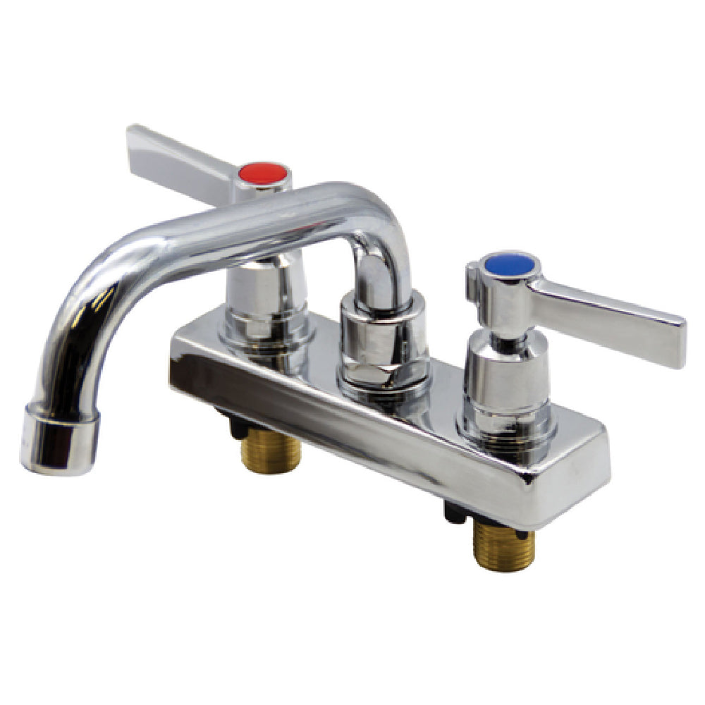 The Advance Tabco K-51 Faucet is a deck-mounted, heavy-duty fixture, specifically designed for high-demand commercial kitchens and industrial environments. This faucet features a 4-inch on-center design and is equipped with a 6-inch swing spout, which provides flexibility and ease of use in various applications. The colored hot and cold indexes allow for clear identification and operation, enhancing user efficiency. It is engineered with a flow rate of 1.0 GPM (3.8 LPM) at 60 PSI, ensuring water conservation without compromising performance. The brass body and spout are chrome-plated, offering durability and resistance to corrosion, while the chrome-plated handles add a sleek finish. Notably, this faucet is lead-free, aligning with safety and health standards. The Advance Tabco K-51 Faucet is ideal for establishments that require a reliable and robust plumbing solution, catering to both safety and functionality in high-usage settings.