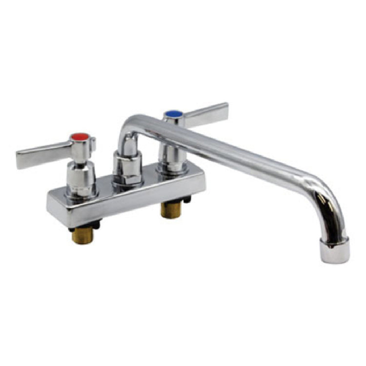 The Advance Tabco K-53 Faucet Heavy Duty 4" OC is a meticulously engineered piece designed for demanding environments such as commercial kitchens, laboratories, and industrial settings where durability and reliability are paramount. This deck-mounted faucet features a 12" swing spout, providing exceptional reach and flexibility for various washing and filling applications. Its 4" on center (OC) configuration ensures compatibility with a wide range of sink setups, making it a versatile choice for different market segments within the industry. The faucet is constructed to be lead-free, adhering to stringent safety standards and promoting health-conscious usage, thereby meeting the requirements of eco-conscious businesses. Crafted with heavy-duty materials, the K-53 ensures longevity and performance even under rigorous use, making it a cost-effective investment for establishments that prioritize quality and resilience in their plumbing fixtures. Its sleek design not only enhances the aesthetic of any workstation but also complements the functional needs of high-traffic areas, emphasizing both practicality and style. The Advance Tabco K-53 Faucet is a testament to superior craftsmanship, offering a reliable solution for professionals seeking a high-performance faucet that seamlessly integrates into their operational framework.