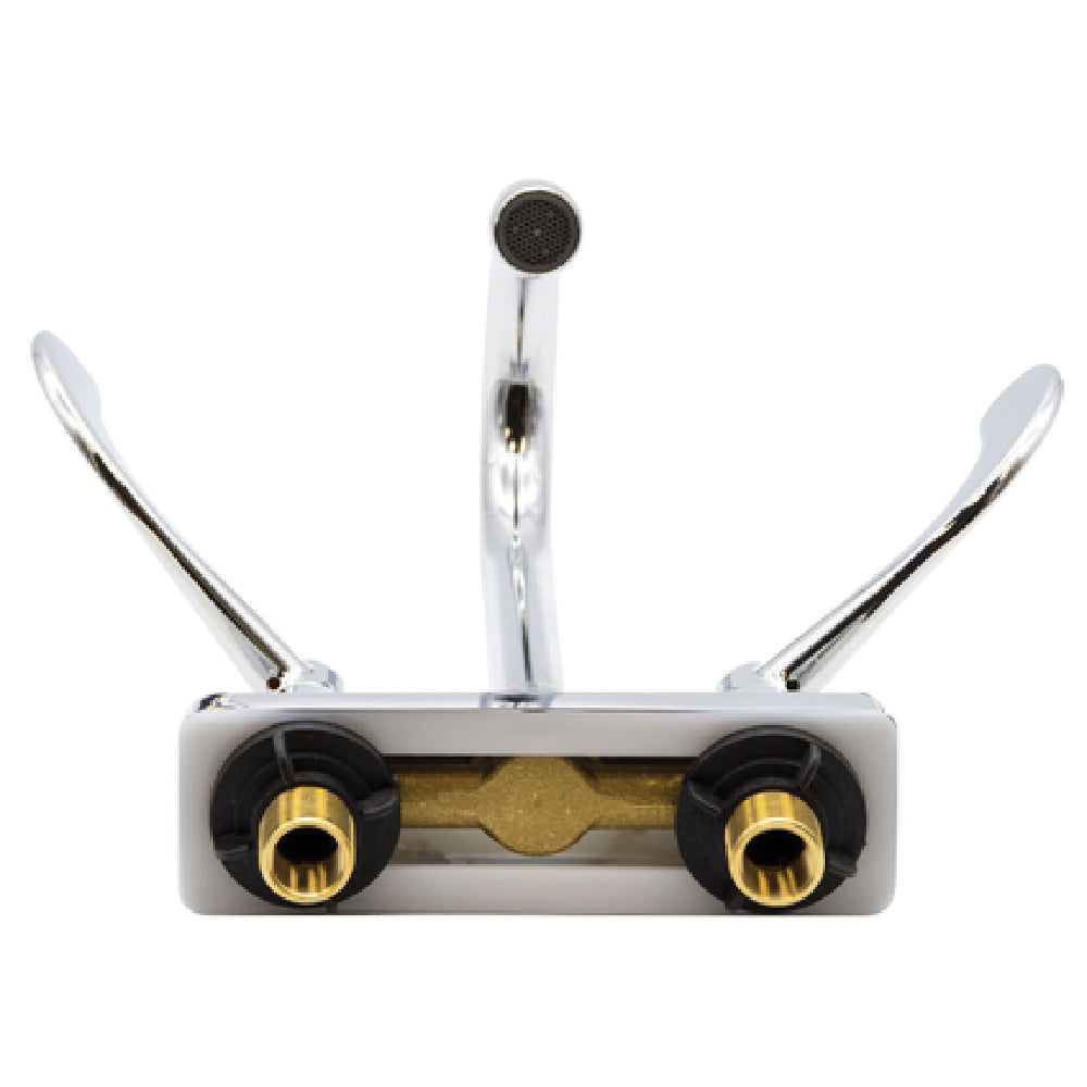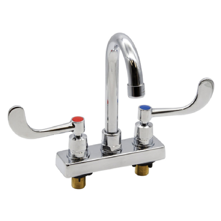 The Advance Tabco K-56 Faucet Heavy Duty 4" OC is a meticulously engineered plumbing fixture designed for robust performance and longevity, ideal for commercial kitchens and industrial settings. This faucet features a 4-inch on-center deck-mounted installation, ensuring a stable and secure fit on a variety of countertops. The 3-1/2" gooseneck spout provides ample clearance for washing and rinsing tasks, making it a versatile choice for different work environments. Equipped with wrist handles, this faucet facilitates ease of use and accessibility, particularly beneficial in high-volume settings where efficiency is key. A notable aspect of the K-56 model is its lead-free construction, aligning with safety standards and making it a reliable choice for establishments prioritizing health and safety compliance. The heavy-duty design underscores its suitability for rigorous use, catering to the demands of diverse market segments within the industry, from restaurants to food processing facilities. Advance Tabco's commitment to quality and functionality is evident in this faucet, offering users a blend of durability and performance essential for professional kitchens and service environments.