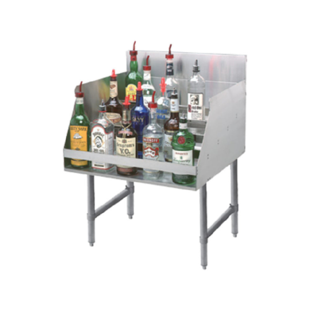 The Advance Tabco LD-2118 Liquor Bottle Display Unit is a meticulously designed piece of equipment featuring five steps, tailored for optimal presentation and accessibility, measuring 18 inches in width, 26 inches in depth, and 33 inches in height. This robust unit is crafted to hold approximately 20 liquor bottles, making it an excellent solution for bars and restaurants seeking to showcase their selection effectively. Its stainless steel construction ensures durability and ease of cleaning, while the 4-inch backsplash offers added protection against spills, maintaining a tidy display area. Supported by galvanized legs, the unit includes adjustable plastic bullet feet, allowing for stability on uneven surfaces and enhancing its adaptability within various environments. Certified by NSF, the Advance Tabco LD-2118 assures compliance with public health standards, making it a reliable choice for establishments prioritizing safety and quality. This liquor bottle display unit is ideal for businesses aiming to streamline their presentation while ensuring the security and accessibility of their liquor inventory. Its strategic design and durable materials cater to the high demands of the food and beverage industry, providing a significant functional and aesthetic value for diverse market segments.