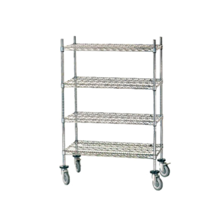 The Advance Tabco MC-1848R Stem Caster Cart is a versatile storage solution designed for diverse industry needs, measuring 18 inches in width and 48 inches in length. This cart is equipped with four wire chrome finish shelves, providing ample space for organizing and storing various items efficiently. Its robust construction is further supported by four 64-inch chrome finish posts, ensuring stability and durability. The cart is highly mobile, featuring four swivel rubber casters with donut bumpers, enhancing maneuverability and protecting against impacts in busy environments. Of these casters, two are fitted with brakes, allowing for secure placement when needed. Ideal for a range of applications from culinary environments to industrial settings, this cart combines functionality with ease of use, making it an essential asset for any workspace requiring flexible and reliable storage capabilities.