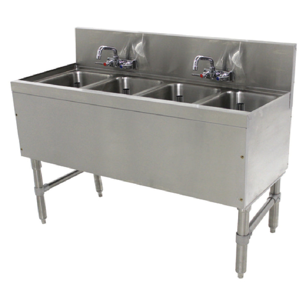 The Advance Tabco PRB-19-44C Prestige Underbar Sink Unit is a versatile and meticulously engineered solution designed for various commercial and industrial settings. Measuring 48"W x 20"D x 36"H, it provides ample workspace while efficiently utilizing space. The unit features four sink compartments, each with dimensions of 14" front-to-back x 10" left-to-right x 10" deep, ensuring adequate capacity for a variety of tasks including food preparation and cleaning processes. Notably, this model does not include drainboards, promoting a streamlined and compact design suitable for environments with limited space. The inclusion of a 7"H backsplash enhances hygiene by preventing water spillage and protecting surrounding surfaces. Constructed entirely from stainless steel, the PRB-19-44C boasts durability and resistance to corrosion, making it ideal for high-traffic areas. Its open frame base with side crossrails improves stability and accessibility. The unit is equipped with two splash mount faucets with 6" swing spouts, facilitating ease of use and versatility. Certified by NSF, this sink unit adheres to strict health and safety standards, meeting the rigorous demands of professional kitchen environments. The Advance Tabco PRB-19-44C exemplifies quality craftsmanship, offering a reliable and efficient underbar solution tailored to diverse operational needs.