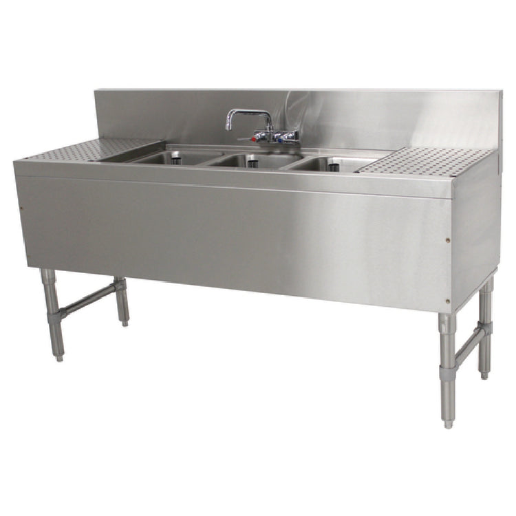 The Advance Tabco PRB-19-63C Prestige Underbar Sink Unit 3-compartment 72"W x 20"D x 36"H is a meticulously designed piece of kitchen equipment, tailored for professional settings where high efficiency and durability are paramount. This unit features three 14" front-to-back x 10" left-to-right x 10" deep sink bowls, providing ample space for washing and rinsing tasks, ideal for bars or restaurants requiring multi-tasking capabilities. Complementing these are the 18" drainboards located on both the left and right sides, facilitating convenient drying and additional workspace. The 7"H backsplash is a practical inclusion that serves to protect walls and maintain cleanliness, while the stainless steel open frame base and side crossrails ensure robust support and stability. Constructed entirely from stainless steel, this unit promises longevity and resistance to corrosion, enhancing its suitability for busy kitchen environments. It includes a splash mount faucet with a 10" swing spout, adding flexibility and ease of use during operations. Certified by NSF, this underbar sink unit meets high standards of public health and safety, making it a reliable choice for the food service industry. The precise design and premium build of the Advance Tabco PRB-19-63C make it a distinctive and valuable asset for diverse culinary settings.
